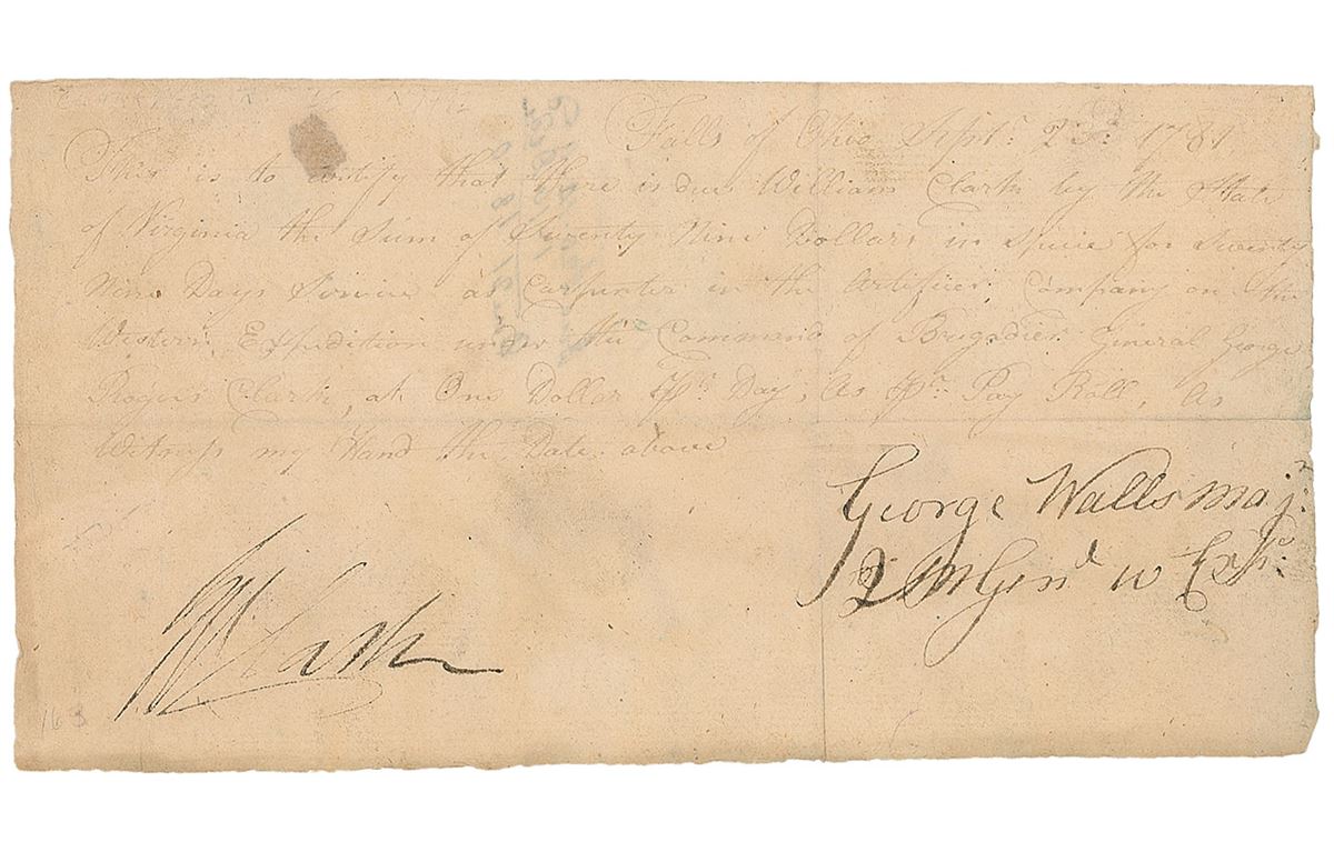 Virginia-born Revolutionary War officer (1752–1818) whose success in capturing crucial lands in the Northwest Territory greatly weakened British control and influence and earned him the sobriquet ‘Conqueror of the Old Northwest.’ Manuscript DS, signed “G. R. Clark,” one page, 8 x 4.25, September 23, 1781. General Clark signs a certification that his brother William is owed by the state of Virginia “the sum of seventy-nine dollars in Specie for seventy-nine days’ service as carpenter in the Artificer Company on the Western Expedition under the command of Brigadier General George Rogers Clark at one dollar per day.” Signed in the lower left by Clark and countersigned on the right by George Walls. Central vertical and horizontal folds, light soiling, and the body of the document very light but legible, otherwise fine condition.