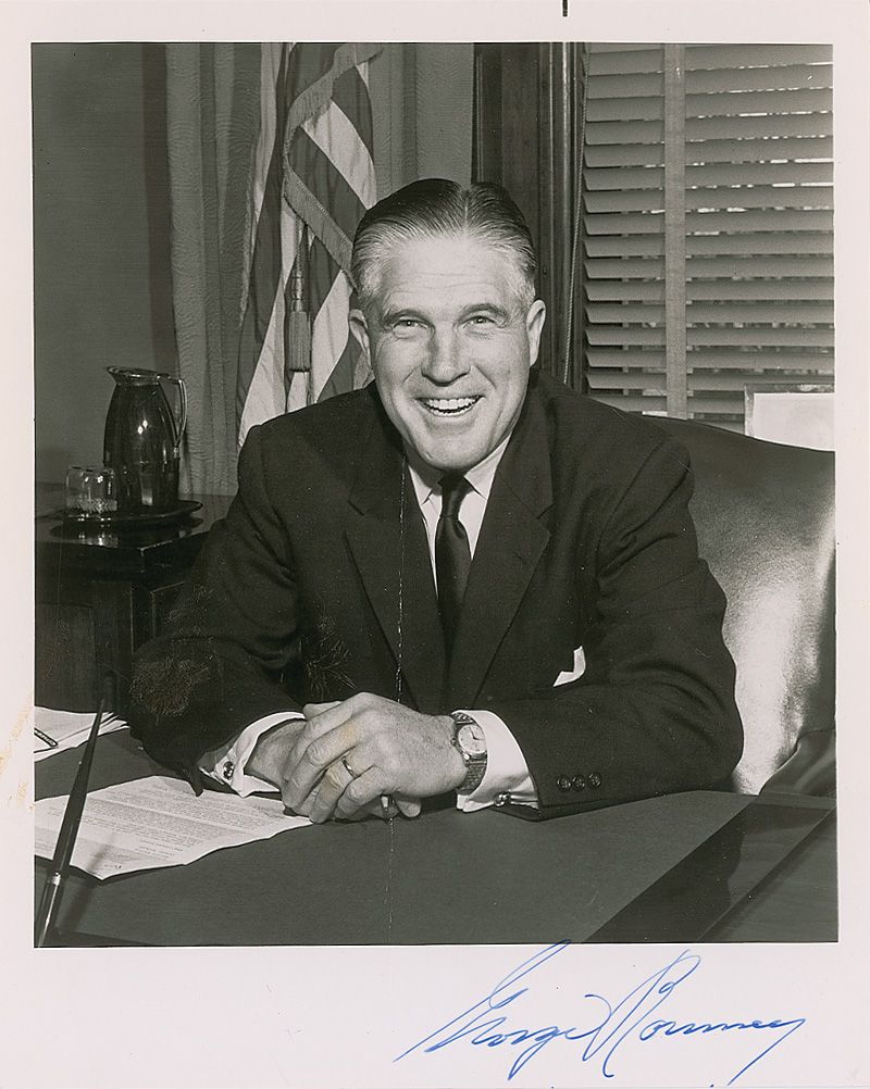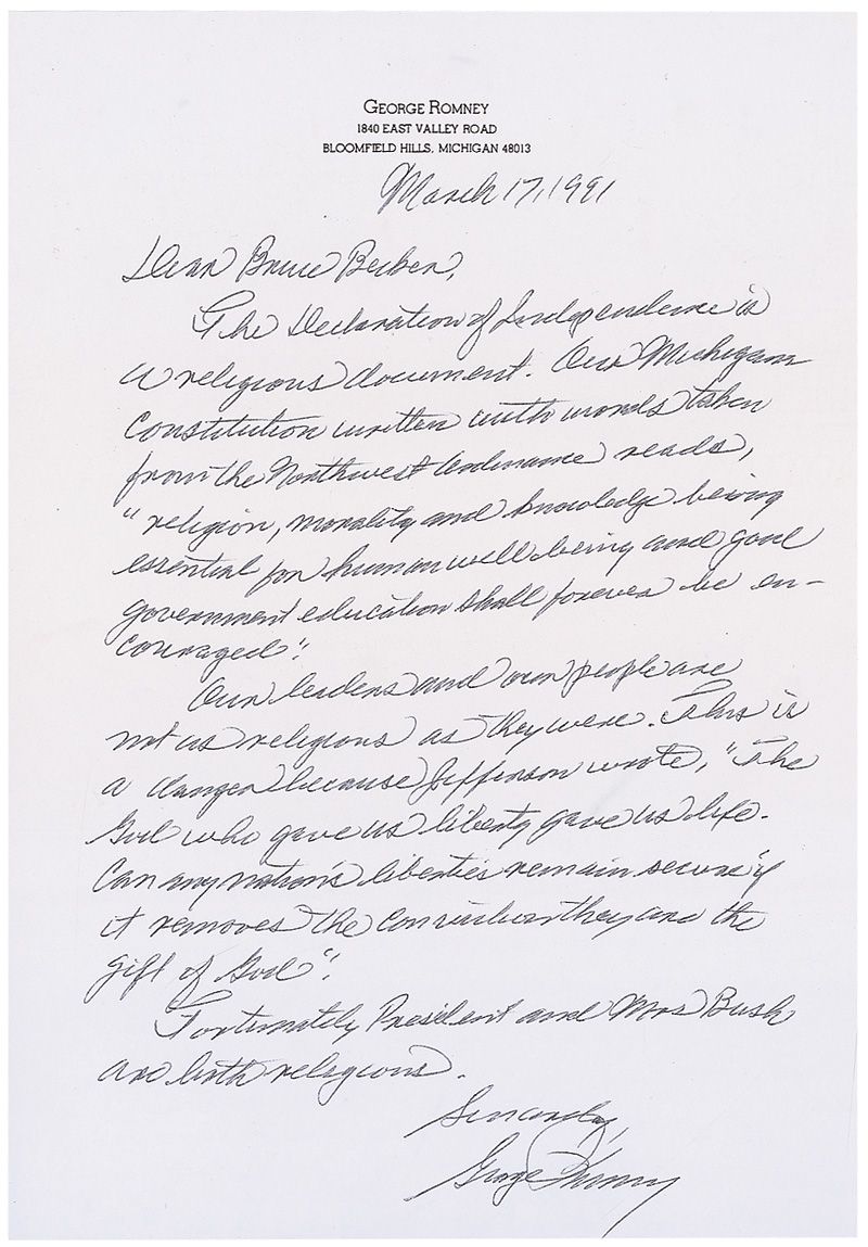 Two items. ALS, one page, 7.25 x 10.5, personal letterhead, March 17, 1991. A letter regarding the state of religion in the United States. In full: “The Declaration of Independence is a religious document. Our Michigan Constitution written with morals taken from the Northwest Ordinance reads, ‘religion, morality and knowledge being essential for human well being and good government education shall forever be encouraged.’ Our leaders and our people are not as religious as they were. This is a danger because Jefferson wrote, ‘The God who gave us liberty gave us life. Can any nation’s liberties remain secure if it removes the conviction they are the gift of God?’ Fortunately President and Mrs. Bush are both religious;” and a glossy 8 x 10 photo of Romney as governor, signed in blue ink. Letter in fine condition, photo in very good condition, with a central vertical crease and scattered impressions.