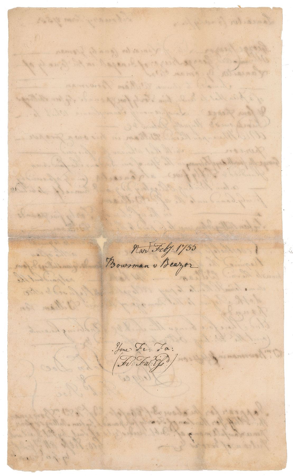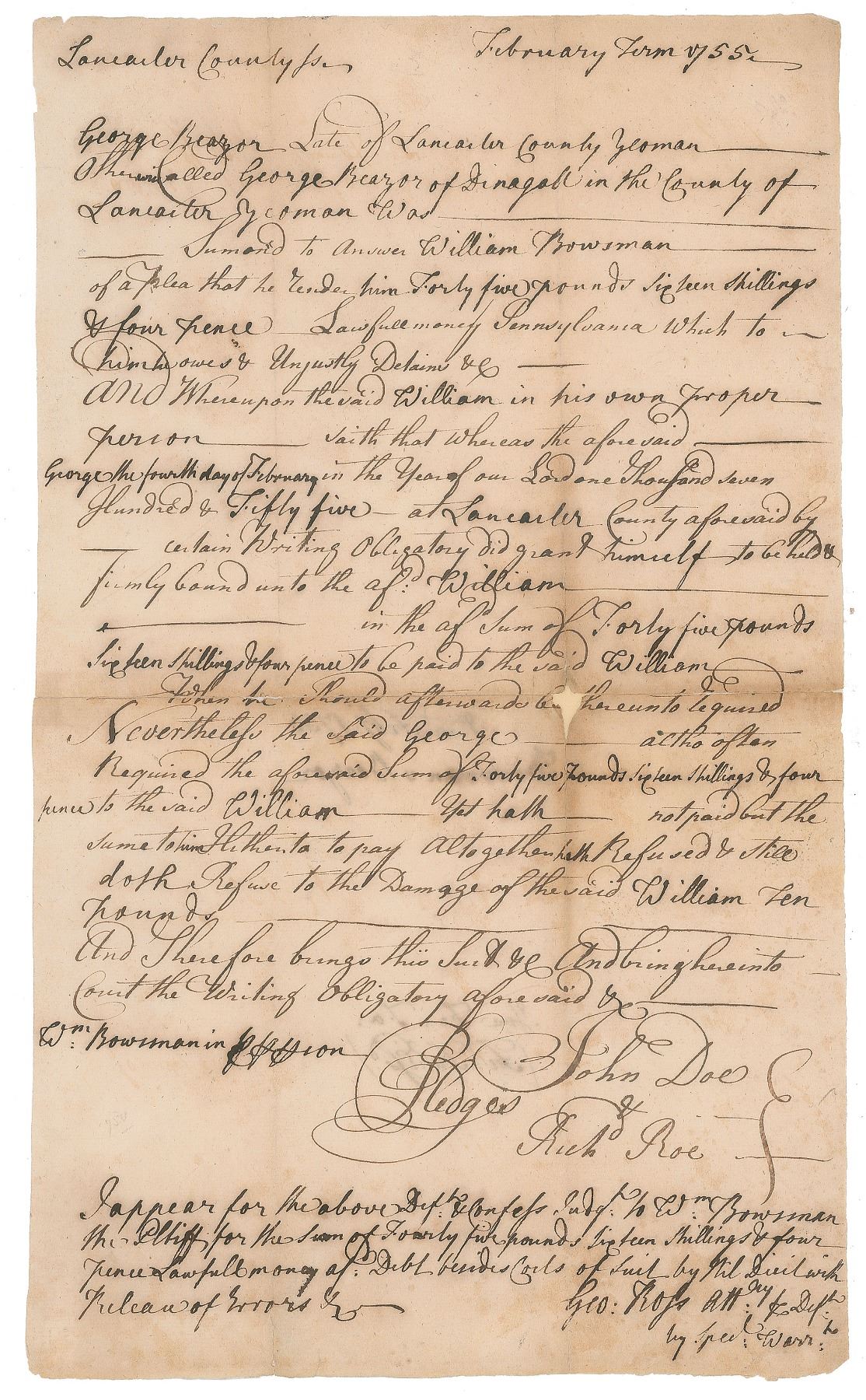Manuscript document with an autograph endorsement signed "Geo: Ross, Att'y Deft.," one page, 7.5 x 12.5, February 1755. Legal document concerning a financial dispute between George Reazor and William Bowsman, endorsed at the conclusion by Ross: "I appear for the above Def't & Confess Judg't to Wm. Bowsman the Pltiff for the sum of Fourty five pounds sixteen shillings & four pence Lawfull money." In very good to fine condition, with some light toning, and a repair to separation along the central horizontal fold.