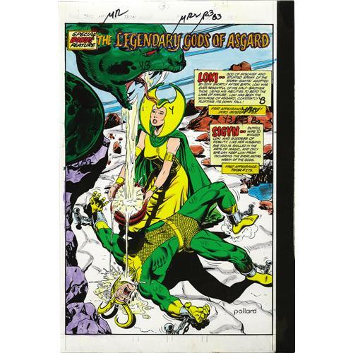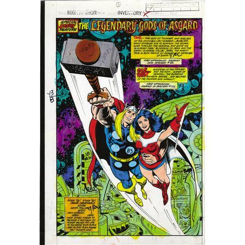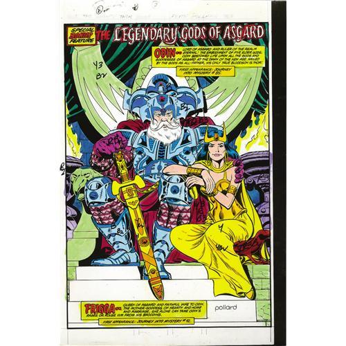 <B>George Roussos - Thor #303 Color Guide, Group of 22 (Marvel, 1981).</B></I> George Roussos created these vivid color guides for <B>Thor</B></I> #303. Five pin-up pages of the "Legendary Gods of Asgard" were showcased in this issue. Each page has an image area of 6" x 9", and these photostatted pages, which are also known as "silverprints," were hand colored by Roussos, with numbered color indications throughout. Aside from light overall wear, the color guides are in Very Good condition.