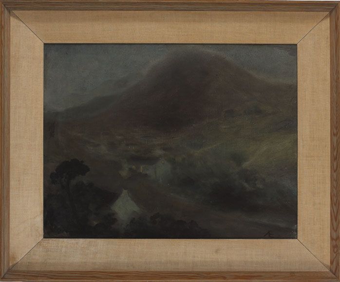 George Russell-NIGHT SCENE WITH COTTAGES AT BASE OF A MOUNTAIN