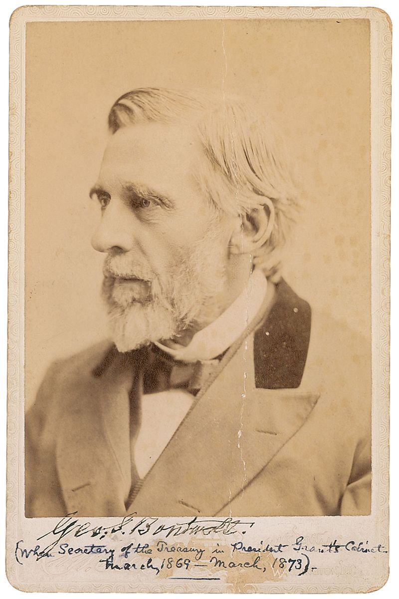 Governor of Massachusetts who went on to serve as secretary of the treasury under U. S. Grant (1818–1905). Original 4.25 x 6.5 cabinet photo by C. M. Bell of Washington, signed on the mount in black ink, “Geo. S. Boutwell.” In very good condition, with a heavy central vertical crease, some spotting to the right side of the image, and a collector’s notation below the signature.