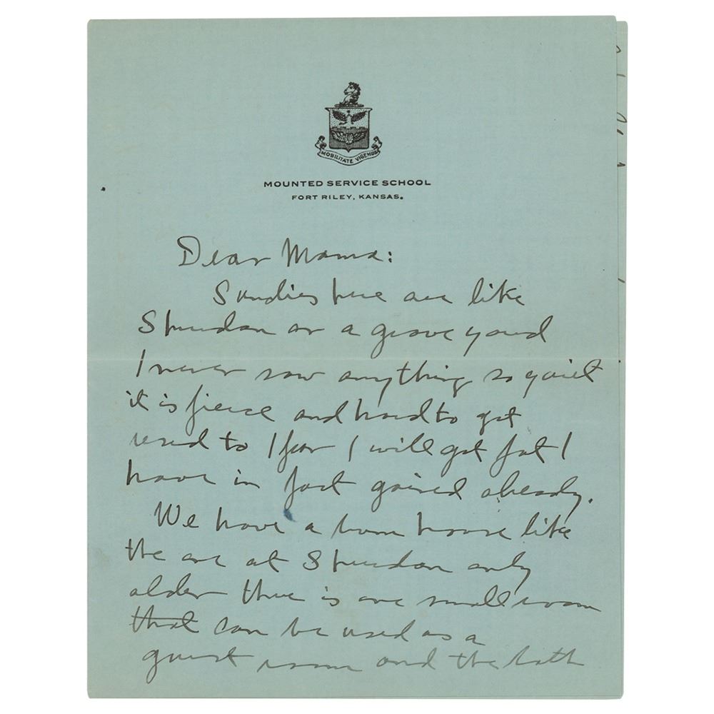 ALS signed “George S. Patton, Jr.,†four pages on two adjoining sheets, 5.5 x 7, Mounted Service School, Fort Riley, Kansas letterhead, no date but likely circa 1913. Letter to his "Mama," in part: "Sundies here are like Sheridan or a grave yard I never saw anything so quiet it is fierce and hard to get used to I fear I will get fat I have in fact gained already. We have a brown house like the one at Sheridan…the bath tub is so small that you have to wash half at a time. I have been painting it a little at a time. The house not the tub, and it looks better now. I started my instruction Thursday and gave two lessons with fair success so I hope it will be all right. So far I have been able to take the riding course with the class of course it does not amount to much yet just riding at a walk and trot and getting settled in the saddle…If there is not room for you all at the house there is a hotel in Junction City…it is perfectly dead just now and will be until the 13th Cav. comes back. There is a regiment of artillery here but they are of no use socially." In fine condition. Accompanied by a modern glossy photo of Gen. Patton.