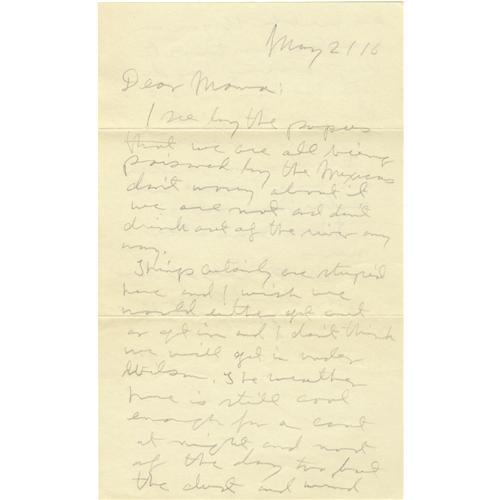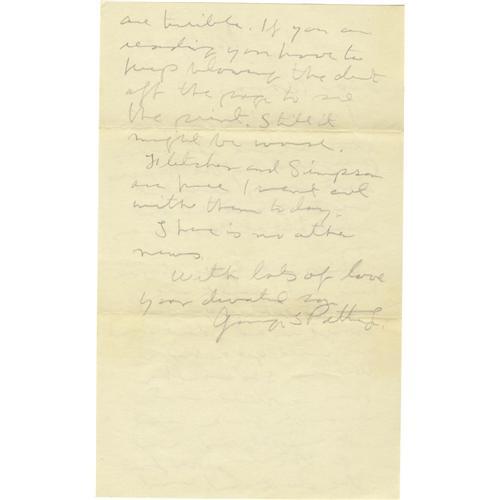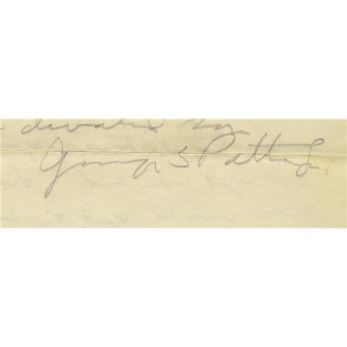 <B>George S. Patton Autograph Letter Signed</B></I> "<I>George S. Patton, Jr</B></I>" in pencil. One page, both sides, 5.5" x 9", May 21, 1916, written to his mother while in Mexico. In part, "<I>I see by the papers that we are all being poisoned by the Mexicans, don't worry about it we are not and don't drink out of the river anyway. Things certainly are stupid here and I wish we would either get out or get in and I don't think we will get in under Wilson. The weather here is still cool enough for a coat at night...but the dust and wind are terrible. If you are reading you have to keep blowing the dust off the paper to see the print. Still it might be worse.</B></I>" In 1916, Patton rode with Pershing during the United States Punitive Expedition to Mexico in pursuit of Pancho Villa. It was during that expedition that Patton first rose to national prominence by killing General Julio Cardenas, commander of Villa's personal bodyguard. The campaign was famous as it marked the first time that motor vehicles (Dodge touring car) were ever used in actual combat by the U. S. Army. When referring to his wife driving a "machine" Patton may be referring to one of those cars. In fine condition, with one horizontal mailing fold bisecting signature. <BR><BR><b>Shipping:</b> Books & Catalogs (<a target="_blank" href="http://www.heritageauctions.com/common/shipping.php">view shipping information</a>)