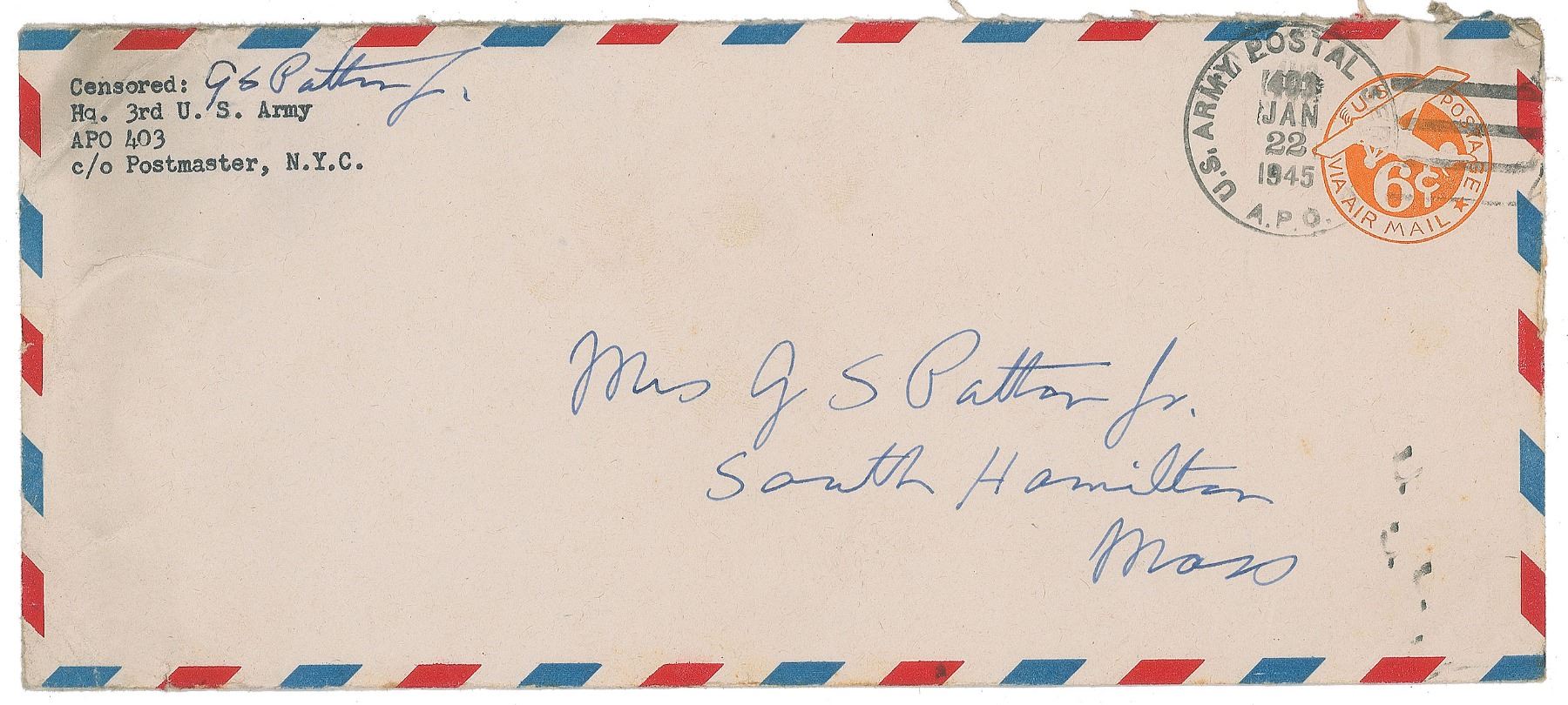 World War II–dated airmail envelope, 9.5 x 4.25, addressed by Patton to "Mrs. G. S. Patton, Jr., South Hamilton, Mass.," and signed as a censor in the upper left, "G. S. Patton, Jr." Postmarked on January 22, 1945, at the end of the Battle of the Bulge. In very good to fine condition, with some light creasing and soiling.
