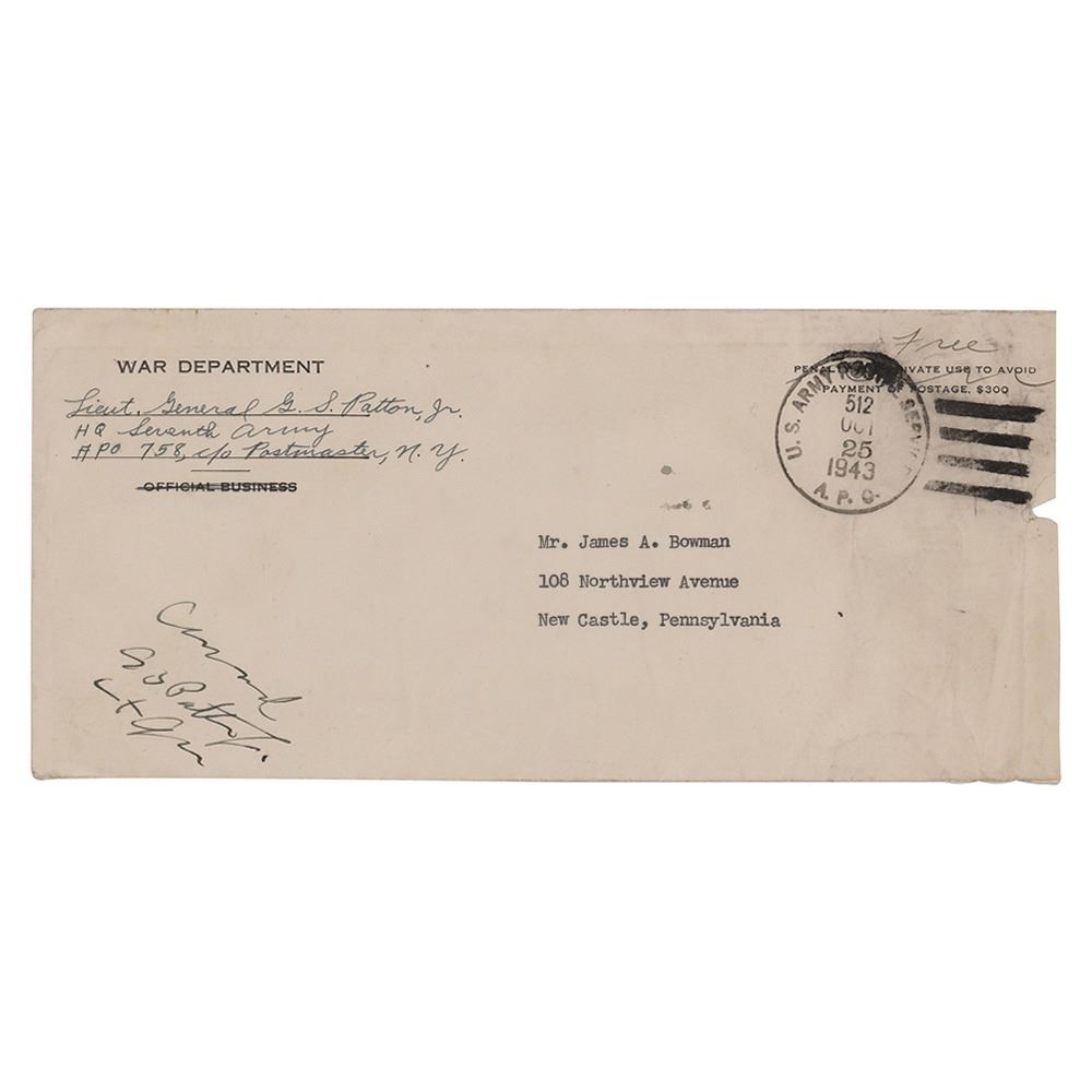 World War II–dated official War Department mailing envelope, 8.5 x 4, signed in the lower left corner in fountain pen with a censorship signature, "Censored, G. S. Patton, Jr., Lt. Gen." Postmarked on October 25, 1943. In very good to fine condition, with creasing to the right side.