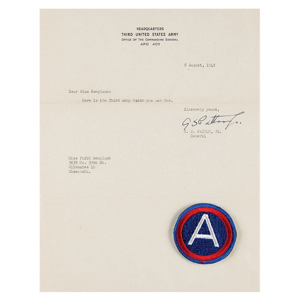 An embroidered 2.5Ë patch of the Third United States Army insignia, presented by General George S. Patton to admirer Faith Senglaub, which is accompanied by a World War II-dated transmittal TLS signed “G. S. Patton, Jr.,†one page, 8.25 x 10.5, personal Headquarters, Third United States Army, Office of the Commanding General letterhead, dated August 8, 1945, which reads, in full: “Here is the Third Army Patch you ask for.†In overall fine condition. Accompanied by the original mailing envelope. A desirable WWII pairing linked to 'Patton's Own,' the foremost fighting force during the European Theatre.