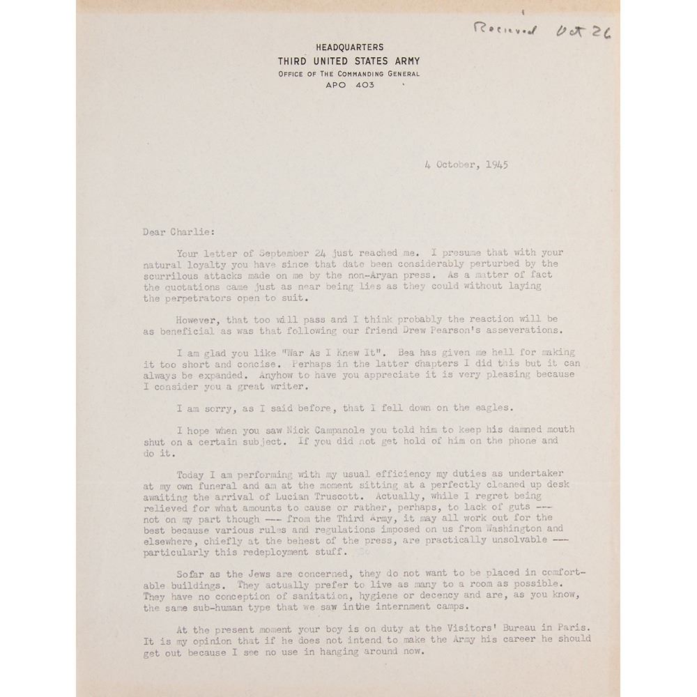 TLS signed “G. S. Patton, Jr.,” two pages, 8.25 x 10.5, Headquarters, Third United States Army, Office of the Commanding General letterhead, October 4, 1945. An astoundingly frank and revealing letter to his former aide, Lt. Col. Charles R. Codman, exposing Patton's isolation and depression following the end of the war in Europe, and revealing a bitter anti-Semitism. At this time, General Patton, who not long before had been instrumental in securing the Allied victory in Europe, was profoundly out of favor with both his military superiors and the civilian press corps. Critics and many former colleagues were shocked by Patton's insinuation that Schutzstaffel (or SS) troops were typically no different from conscripts in other armies and by his dismissive treatment of Displaced Persons. After a combative press conference on September 22nd, stories appeared in a number of stateside newspapers blaming Patton for the appalling conditions at many camps for Displaced Persons, many of whom were Jews. The press also reported that General Eisenhower ordered Patton to improve the camps under his area of command and also ordered him to attend a Yom Kippur service. A week after the press conference, on September 29th, Ike transferred Patton to a minor post with the Fifteenth Army in Bad Nauheim.