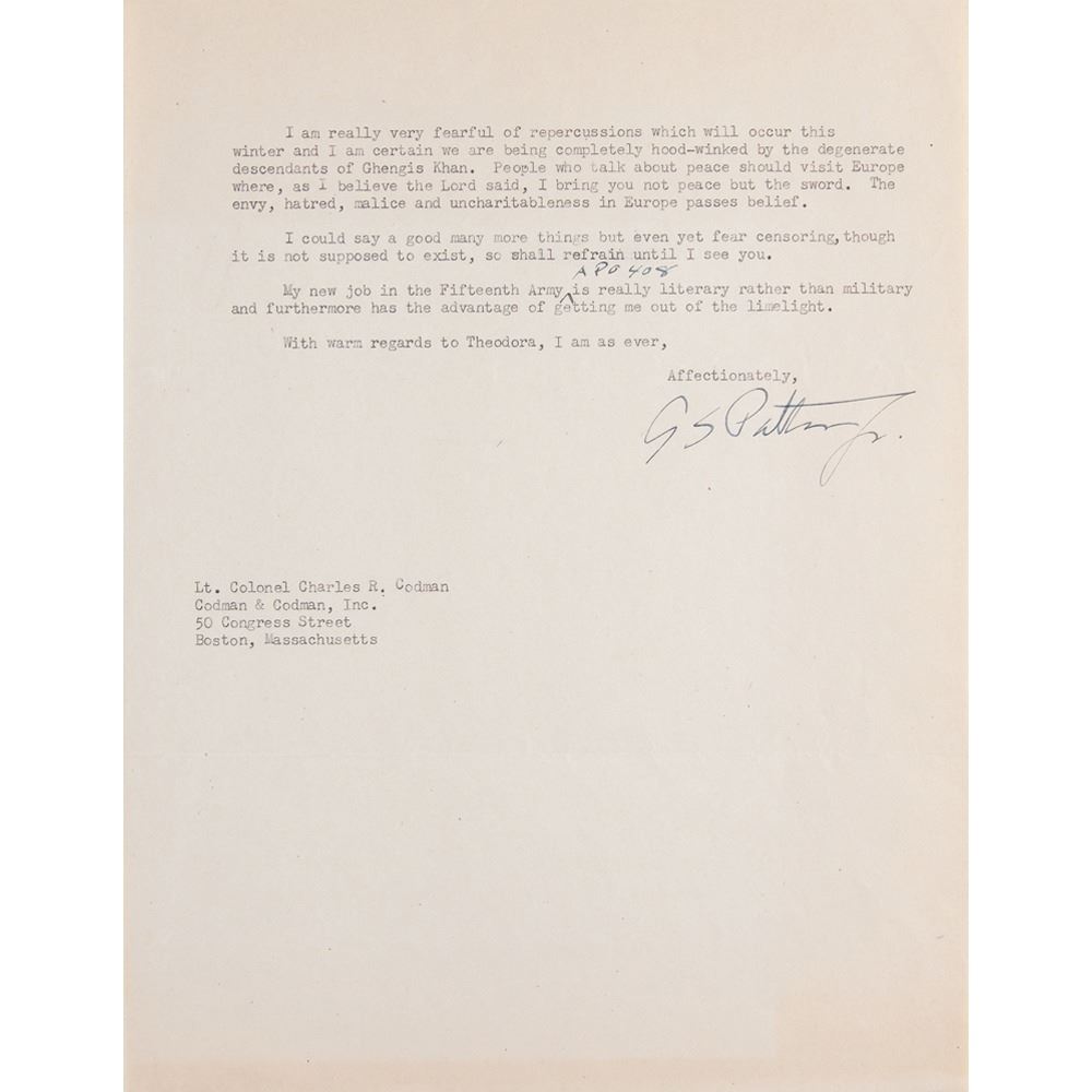 In closing, Patton observes, "I could say a good many more things but even yet fear censoring, though it is not supposed to exist, so shall refrain until I see you. My new job in the Fifteenth Army is really literary rather than military and has the advantage of getting me out of the limelight.” Patton would not see Codman again; on December 9th, the former was involved in a wreck of military vehicles and died of his injuries 12 days later. In fine condition. Accompanied by a custom beige cloth-bound presentation folder with slipcase.