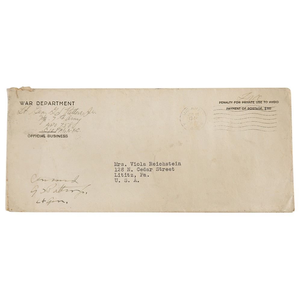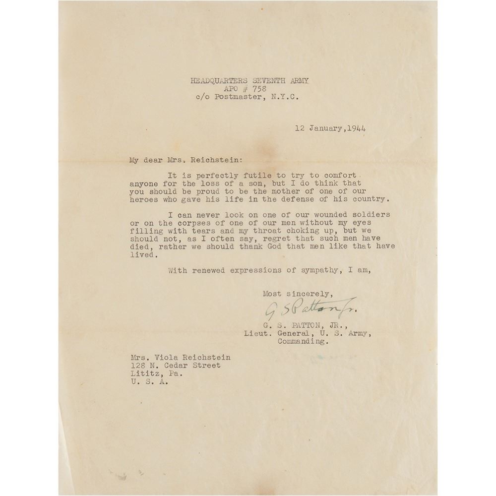 TLS signed "G. S. Patton, Jr.," one page, 8 x 10.5, January 12, 1944, to Viola Reichstein, in part: "It is perfectly futile to try to comfort anyone for the loss of a son, but I do think that you should be proud to be the mother of one of our heroes who gave his life in the defense of his country. I can never look on one of our wounded soldiers or on the corpses of one of our men without my eyes filling with tears and my throat choking up, but we should not, as I often say, regret that such men have died, rather we should thank God that men like that have lived." Includes the original mailing envelope, signed in the lower left corner, "Censored, G. S. Patton, Jr., Lt. Gen."