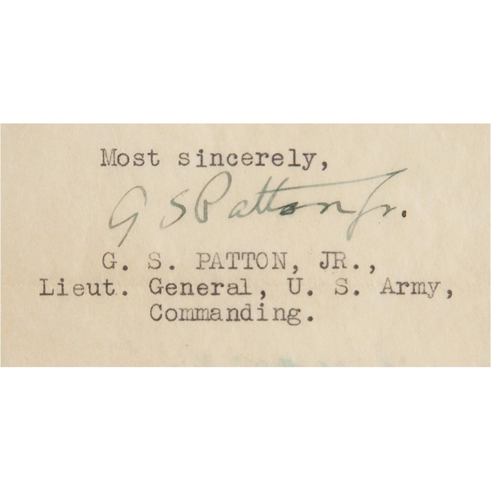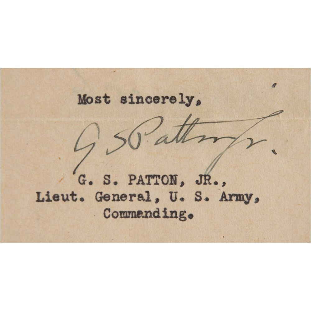 TLS signed "G. S. Patton, Jr.," one page, 8 x 10.5, December 5, 1943, to Viola Reichstein, in part: "At the present time, the 180th Infantry is not under my command, but I am inclosing a copy of a letter which I have written and to which you will unquestionably receive an answer. However, to reassure you, I will state that the War Department is very quick and accurate in giving notice of fatal wounds; therefore, since you have not heard anything for three weeks I am sure that it is a good sign and that your son is probably well on the road to recovery."