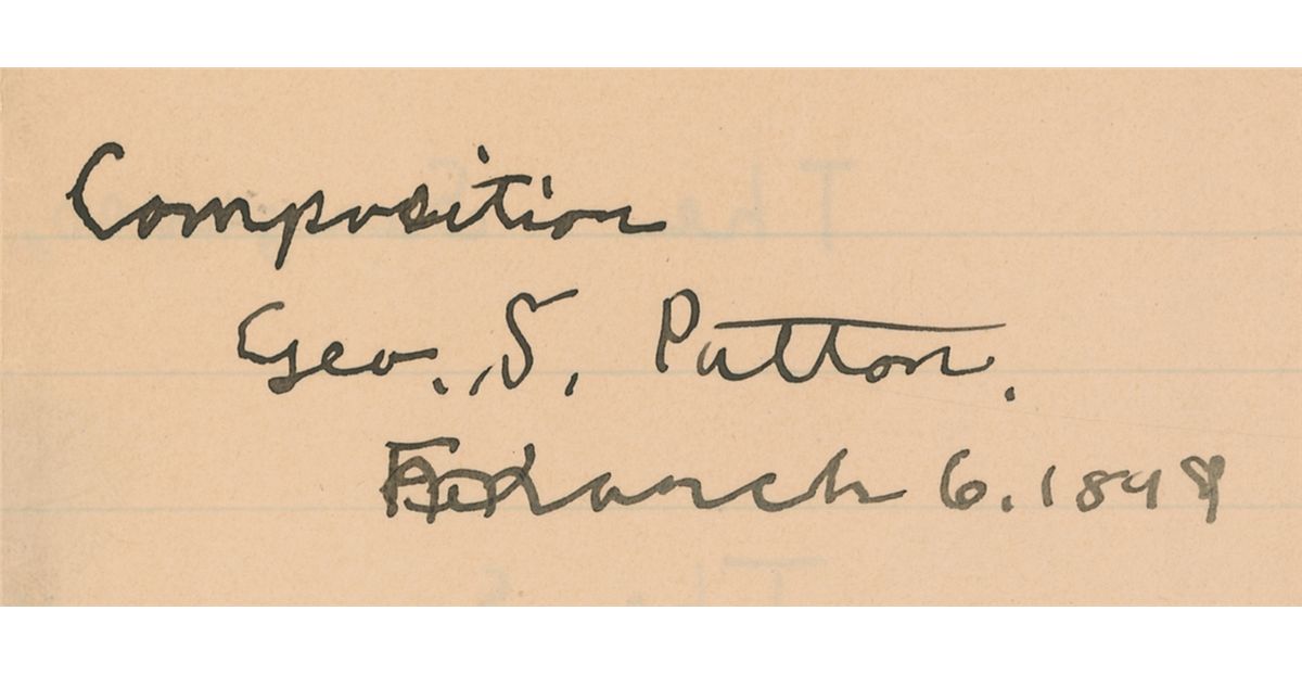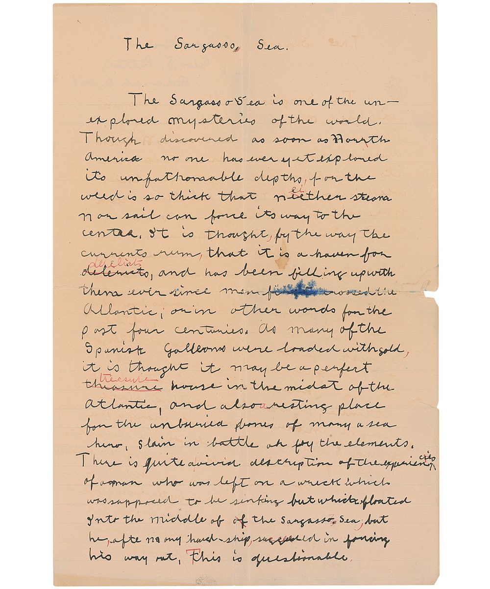 AMS, one lightly-lined page, 8 x 12, entitled ‘The Sargasso, Sea,’ signed on the reverse “Geo. S. Patton, March 6, 1899.” Composition written for a class assignment at age 13. In full, with original punctuation and spelling retained: “The Sargasso Sea is one of the unexplored mysteries of the world. Though discovered as soon as Norrth America no one has ever yet explained its unfathomable depths for the weed is so thick that niether steam nor sail can force its way to the center. It is thought by the way the currents run that it is a haven for delericts, and has been filling up with them ever since men first crossed the Atlantic, or in other words for the past four centuries. As many of the Spanish Galleons were loaded with gold it is thought it may be a perfect treasure house in the midst of the Atlantic, and also resting place for the unburied bones of many a sea hero, slain in battle or by the elements. There is quite a vivid description of the experiencies of a man who was left on a wreck which was supposed to be sinking but which floated into the middle of of the Sargasso, Sea but he afte many hard-ship succeded in forcing his way out, this is questionable.” Patton’s teacher has corrected his various errors in red ink. Central horizontal and vertical folds with some tape-repaired separation to each, a few tears to the right side, and a stray ink spot affecting one word in the center, otherwise very good condition. It is a surprisingly well-written essay for a young man who suffered from dyslexia—but we do see some evidence of it, particularly in the misspelling of “derelicts.” As an adult, Patton would joke, “Any idiot can spell a word the same way time after time. But it calls for imagination and is much more distinguished to be able to spell it several different ways as I do.” An incredible manuscript revealing Patton’s mindset at an early age—even then he was thinking about valiant men, great adventure, and wartime heroics.