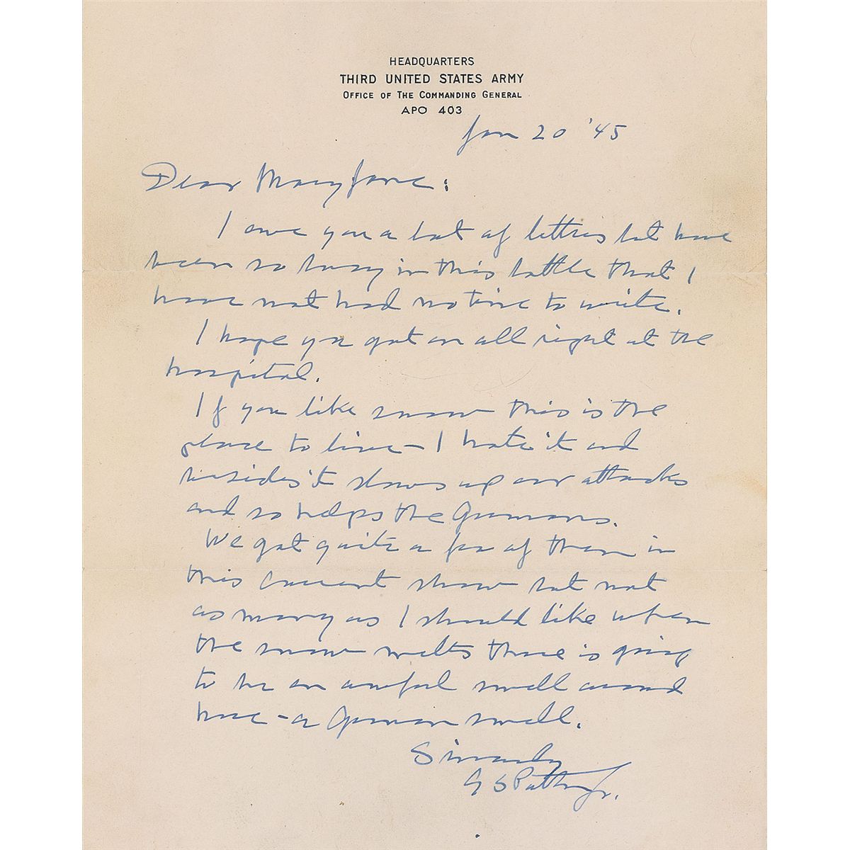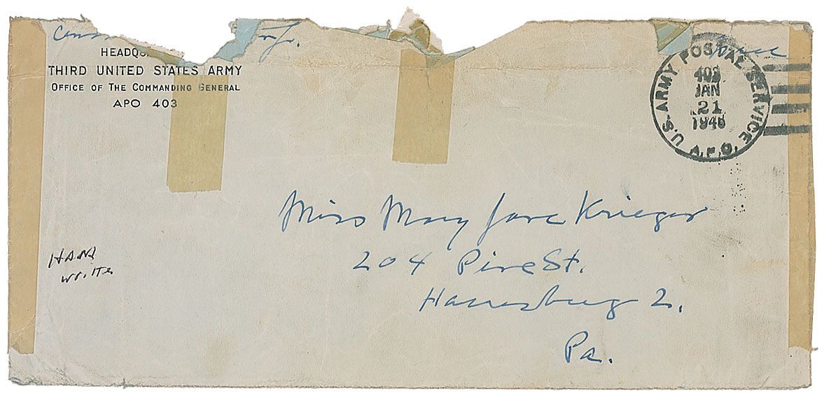 War-dated ALS signed “G. S. Patton, Jr.,” one page, 8 x 10, Headquarters, Third United States Army letterhead, January 20, 1945. Letter to Mary Jane Krieger. In full: “I owe you a lot of letters but have been so busy in this battle that I have not had no time to write. I hope you got on all right at the hospital. If you like snow this is the place to live—I hate it and besides it slows up our attacks and so helps the Germans. We got quite a few of them in this current show but not as many as I should like when the snow melts there is going to be an awful smell around here—a German smell.” In fine condition. Accompanied by the original mailing envelope addressed in Patton’s hand, with a couple of letters of Patton’s censor signature remaining along the top edge.