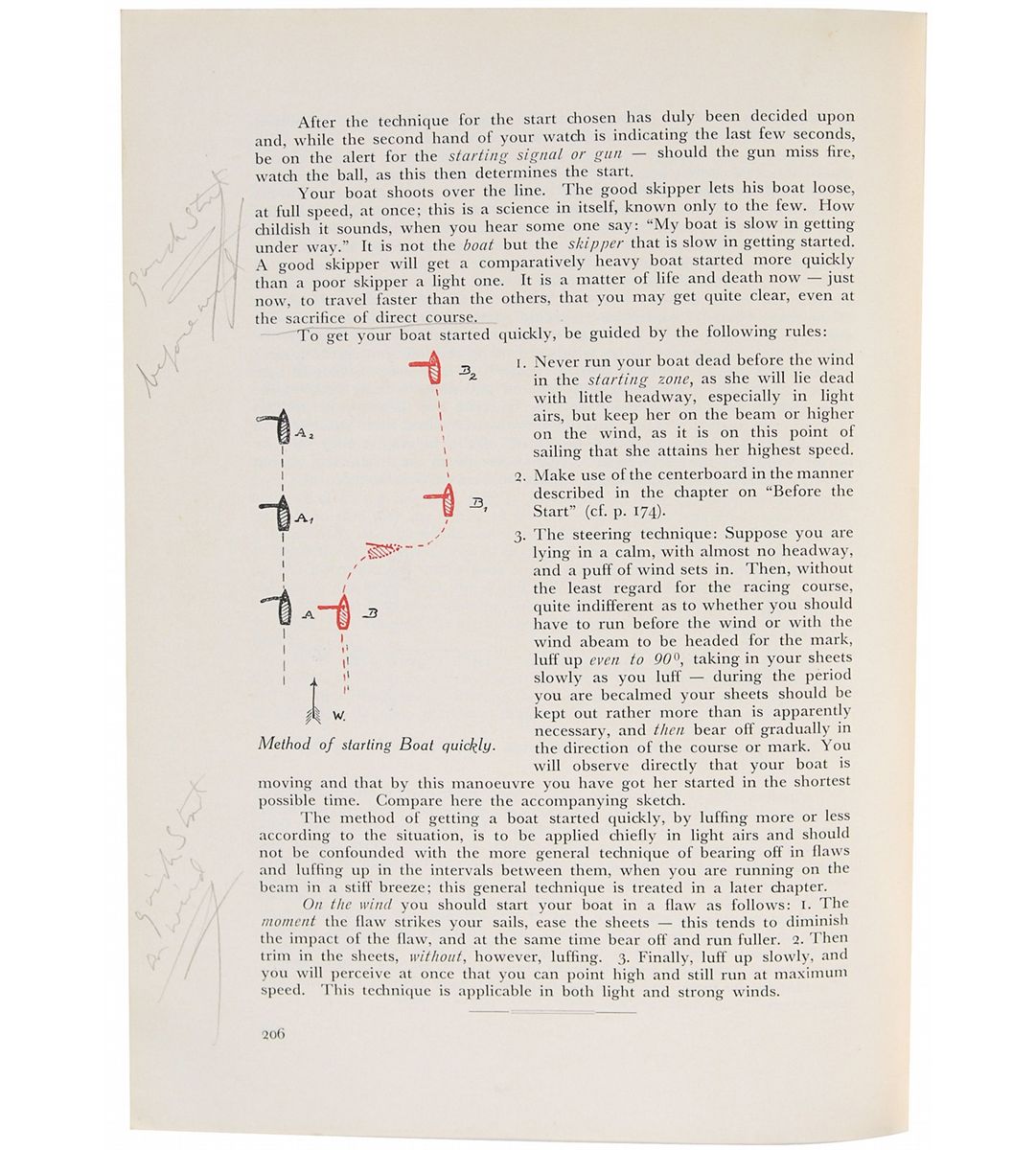 Signed book from Patton’s personal library: Yacht Racing: Aerodynamics of Sails and Racing Tactics by Dr. Manfred Curry. Later printing. NY: Charles Scribner's Sons, 1930. Hardcover, 7 x 9.75, 312 pages. Signed on the first free end page with his ownership signature in pencil, “G. S. Patton, Jr.,” with his own pencil notations in the margins throughout the book on at least 17 pages. A loose sheet of paper with a few pencil notes in Patton’s hand is also inserted within the book. Autographic condition: overall foxing and toning to first free end page, otherwise fine. Book condition: G+/None. Accompanied by a custom-made clamshell presentation case. No other military leader wrote so frequently in his letters or diary what he was reading, and no leader’s library was so well documented since Napoleon’s. Patton’s library, which was almost entirely inherited by his son, Major General George Patton III, was given to West Point, with just a small portion of books, including this one, inherited by other descendants or friends. In 1939, Patton commissioned a yacht to be built for himself—a 63-foot schooner that he forebodingly named ‘When and If,’ saying that he planned to sail the ship ‘when’ World War II was over, and ‘if’ he survived. Though he survived combat, Patton was killed in a car accident before ever returning to the US to enjoy his yacht.