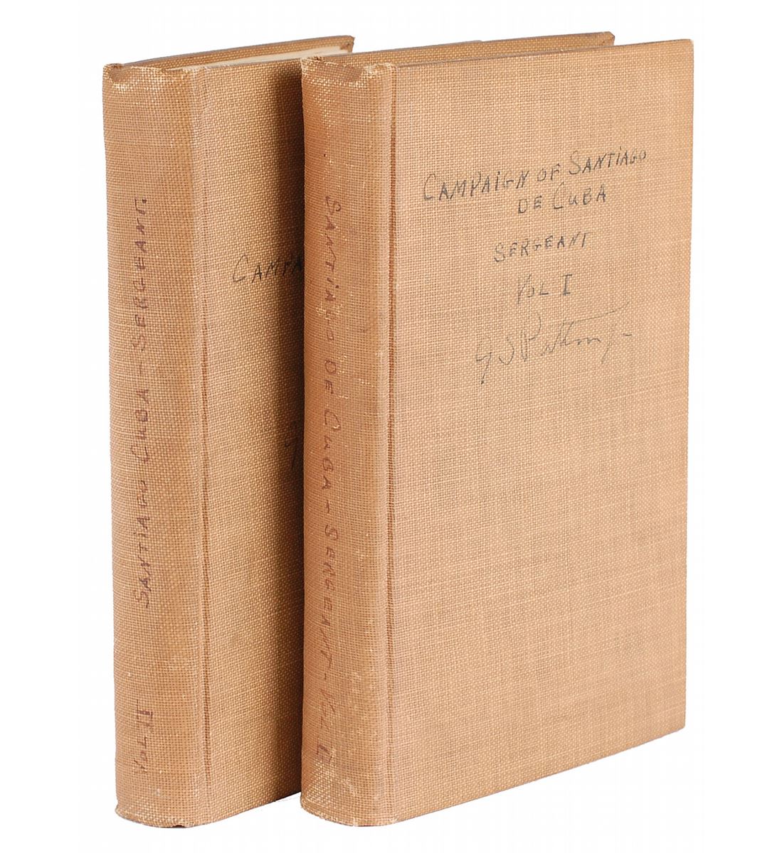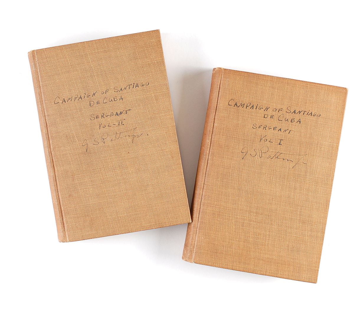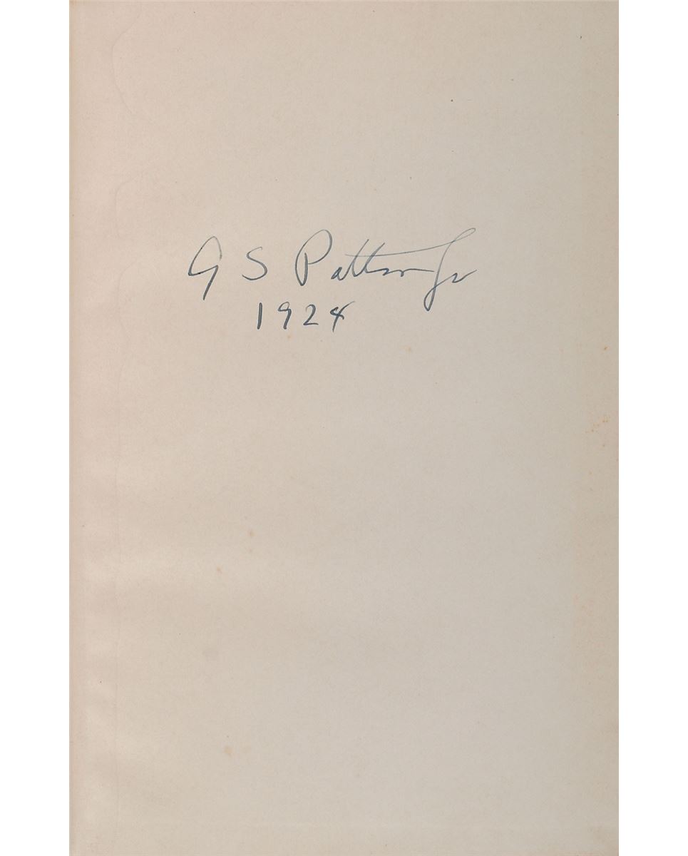 Signed books from Patton’s personal library: The Campaign of Santiago de Cuba, Two Volumes. Later printing. Chicago: A. C. McClurg & Co., 1914. Hardcover, 5.25 x 7.75, 274 and 236 pages. Signed on the front cover of both volumes, “G. S. Patton Jr.,” as well as on the first free end page of Volume II in fountain pen, “G. S. Patton, Jr., 1924.” Patton also writes the title on the spine and cover of each book. Autographic condition: fine, with signatures on the covers a shade or two light. Book conditions: VG-/None in VG+ custom-made quarter leather clamshell boxes. No other military leader wrote so frequently in his letters or diary what he was reading, and no leader’s library was so well documented since Napoleon’s. Patton’s library, which was almost entirely inherited by his son, Major General George Patton III, was given to West Point, with just a small portion of books, including these volumes, inherited by other descendants or friends.