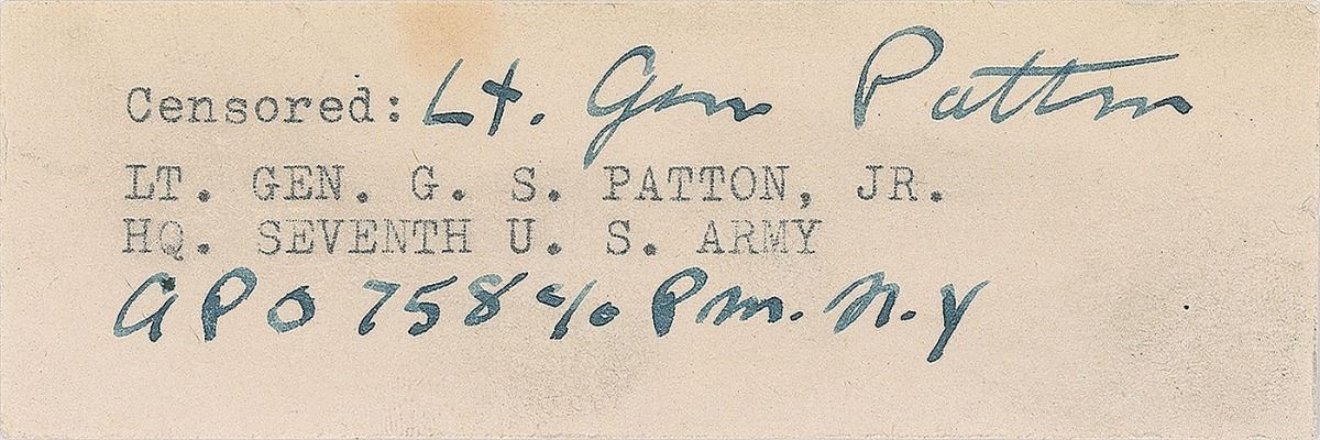 Fountain pen signature, “Lt. Gen. Patton, APO 758 c/o PM. N.Y,” on an off-white 4.25 x 1.25 slip clipped from a mailing envelope. In fine condition. APO 758 was the Grand central Annex address for Palermo, Sicily, a city that Patton and the Seventh Army successfully captured on July 22, 1943.