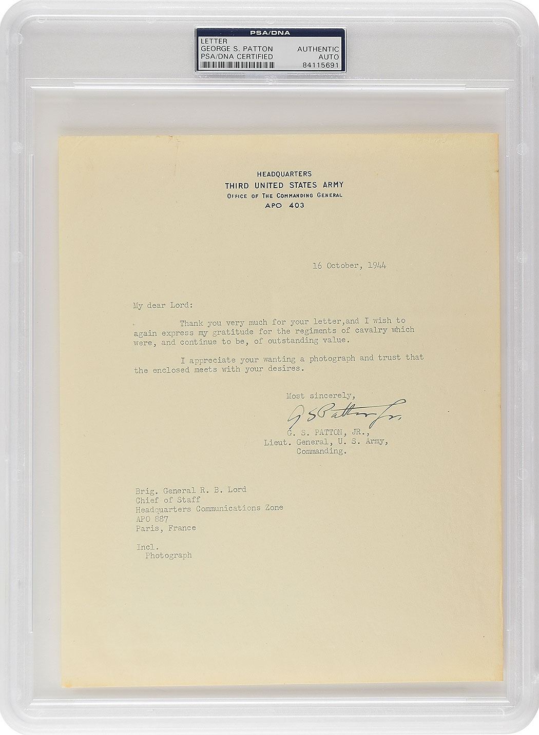 World War II–dated TLS signed "G. S. Patton, Jr.," one page, 8 x 10, Headquarters, Third United States Army letterhead, October 16, 1944. Letter to General R. B. Lord, in full: "Thank you very much for your letter, and I wish to again express my gratitude for the regiments of cavalry which were, and continue to be, of outstanding value." In fine condition. Encapsulated in a PSA/DNA authentication holder.