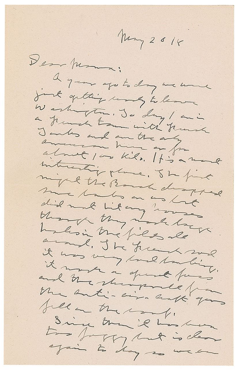ALS signed “George,” three pages, 5.25 x 8.25, May 26, 1918. As a lieutenant colonel, Patton writes home to his mother from France during World War I. In full: "A year ago to day we were just getting ready to leave Washington. To day I am in a French town with French Tanks and am the only American here or for about 100 kils. It is a most interesting place. The first night the Bosch dropped more bombs on us but did not hit any houses though they made large holes in the fields all around. The French said it was very loud bombing. It makes a great fuss and the shrapnel from the anti-air-craft guns fell on the roof. Since then it has been too foggy but is clear again to day so we are looking for more visits this evening. The machines have the same effect as mosquitoes they hum around and you keep expecting something to happen—then it does. But they do not worry you for the chance of being hit is so small as to be negligible and any way there is nothing to do about it. If you are hit you are hit and there will not be enough left for a funeral. I saw a funny thing yesterday. I was taking a walk and passed a huge cross larger than life. On the front of the cross was nailed a sign 'Gas' warning that you must have your mask in the alert position as gas shells have the habit of coming that way. I could not help thinking that such a sign on the cross must be rather an insult to Christ. As gas can hardly please Him. There is a good deal of shooting here so much that you cannot distinguish individual shots it is just a constant roar not so very sharp but like furniture being moved around in an empty house. The Gers are about 4 miles away." Includes an ink signature, "Geo. S. Patton, Jr., San Gabriel," on an off-white 3.5 x 1.5 slip clipped from an envelope. In fine condition.