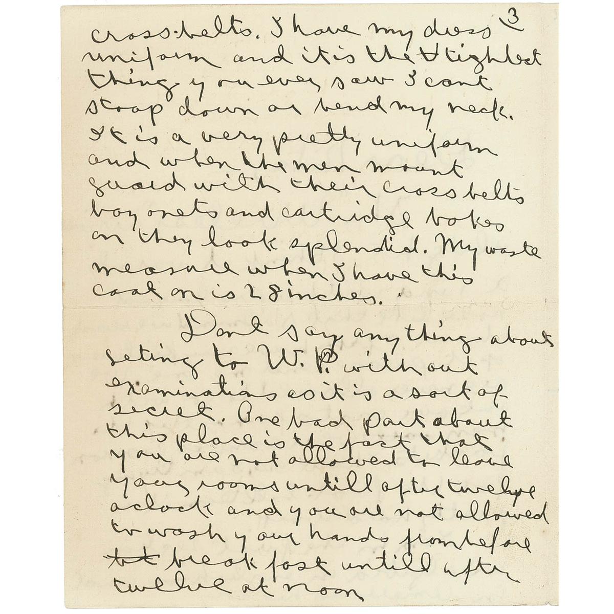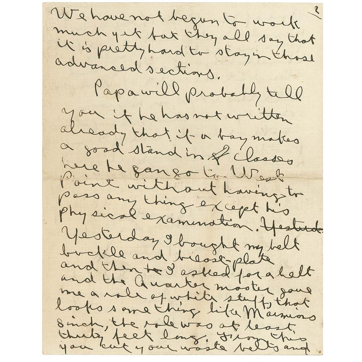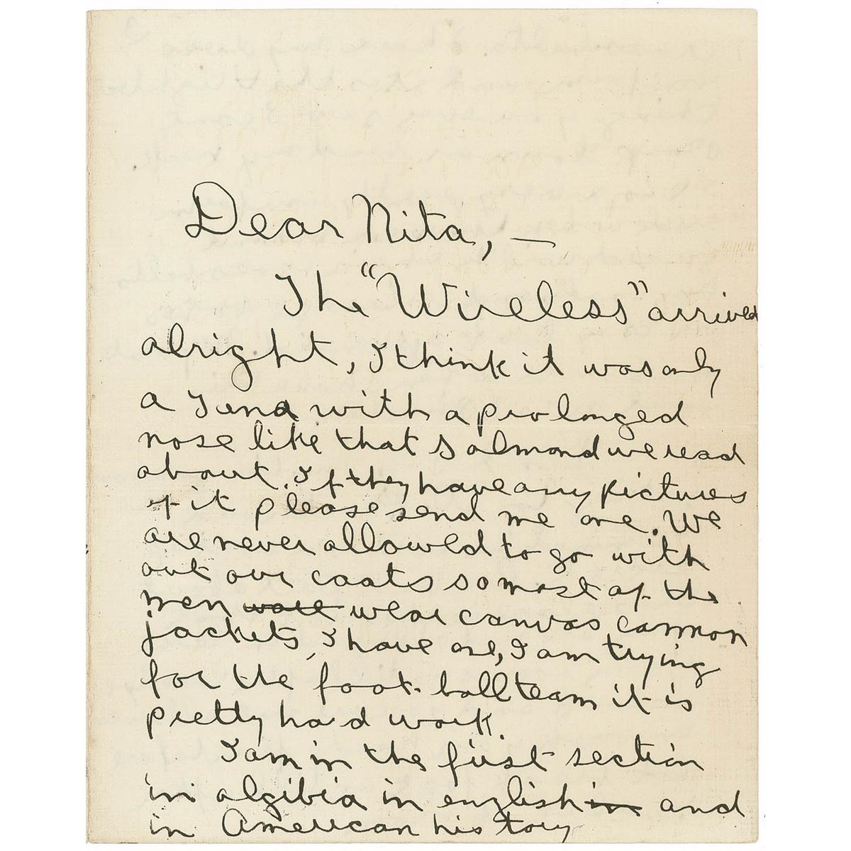ALS signed “Love, Georgie,” four pages on two adjoining sheets, 5.25 x 6.5, no date. Patton writes to his sister Nina. In full, with punctuation and spelling retained: “The ‘Wireless’ arrived alright, I think it was only a Yuna with a prolonged nose like that salmond we read about. If they have any pictures of it please send ne one. We are never allowed to go with out our coats so most of the men wear canvas cannon jackets, I have one, I am trying for the foot-ball team it is pretty hard work.