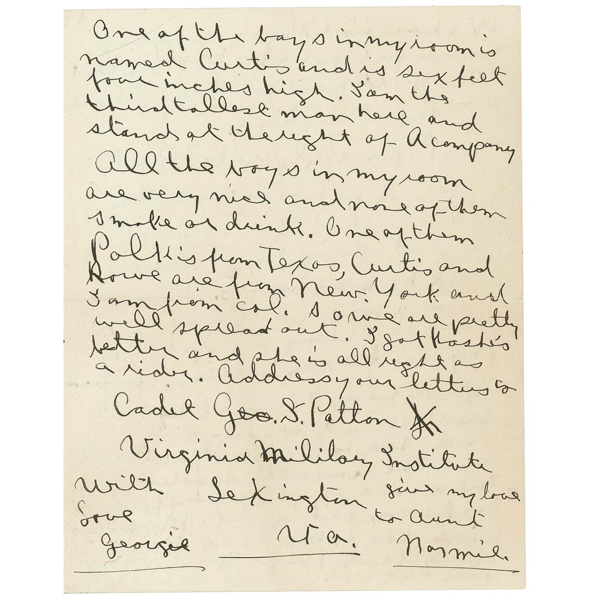 One of the boys in my room is named Curtis and is six feet four inches high. I am the third tallest man here and stand at the right of A company. All the boys in my room are very nice and none of them smoke or drink. One of them Polk is from Texas, Curtis and Rowe are from New York and I am from Cal. So we are pretty well spread out. I got Kashe’s letter and she is all right as a rider. Address your letters to Cadet Geo. S. Patton Jr [he’s crossed out the “eo” and the “Jr.”] Virginia Military Institute Lexington Va. Give my love to Aunt Nannie [his mother’s sister, Nannie Wilson]. With Love Georgie.” In fine condition, with a uniform shade of mild toning, and light show-through from text on reverse.