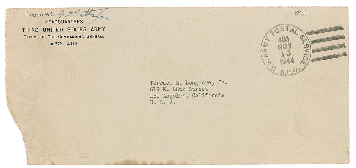 Ink censor signature, “G. S. Patton, Jr.,” at the top of a mailing envelope, postmarked November 13, 1944, and bearing a return address of “Headquarters, Third United States Army.” Envelope is addressed in type to a person in Los Angeles. In very good condition, with missing lower left corner, scattered toning and soiling, and some creasing to top left corner, lightly affecting signature.