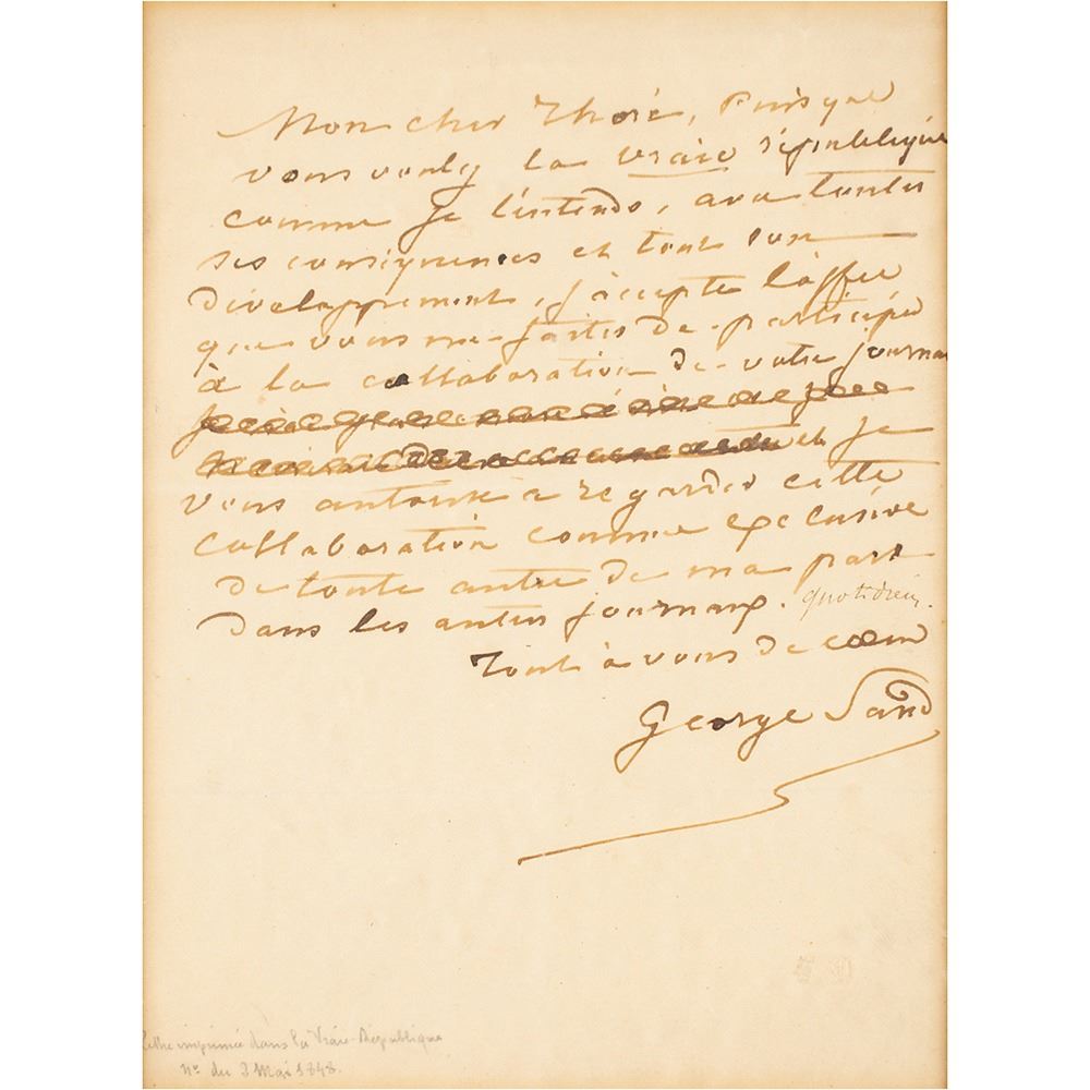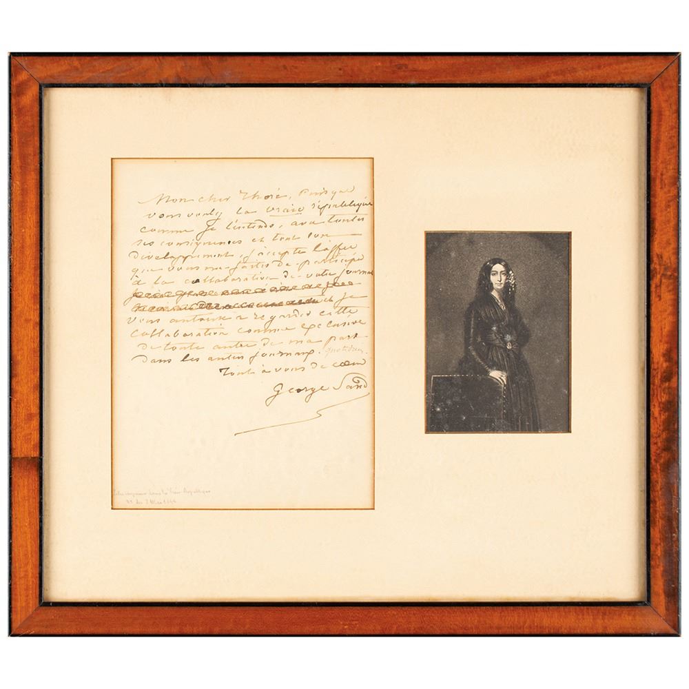 ALS in French, one page, 5 x 7, personal embossed letterhead, no date. Untranslated handwritten letter from the celebrated novelist. A collector's pencil notation to the lower border dates the letter to May 3, 1848. Matted and framed with a small portrait to an overall size of 13.25 x 11.5; frame backing bears a Goodspeed's Book Shop label. In fine condition.