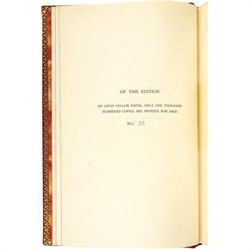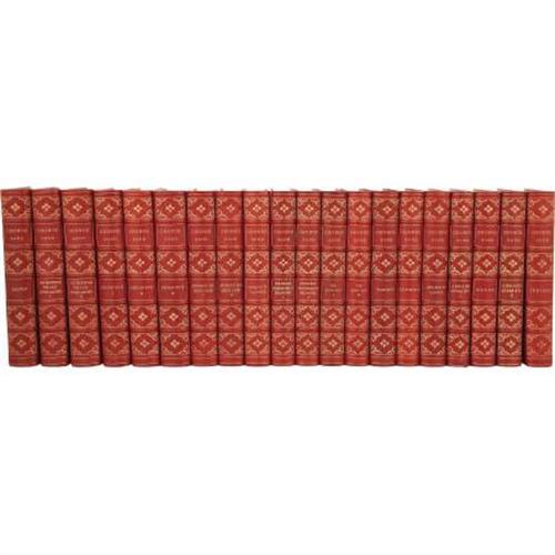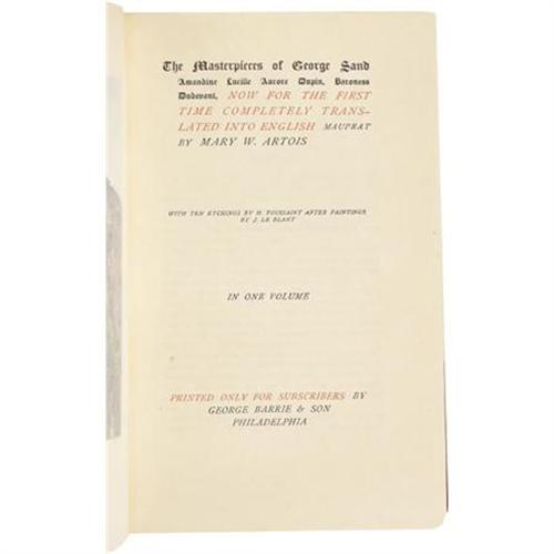 <B>George Sand Amandine Lucille Aurore Dupin, Baroness Dudevant : </B></I><B><I>The Masterpieces of George Sand</B></I></B></I><B>, Beautiful 20 Volume Limited Edition</B></I>. (Philadelphia: George Barrie & Son, 1900-1902), set number 33 of 1000 numbered copies, each volume with a illustrations by different artists, full red morocco with gilt rules on front and rear boards, gilt dentelle, six spine compartments between five raised bands, gilt titles and decoration, Japan vellum paper, all edges gilt, marbled endpapers, 8vo (5.5” x 8.25”), beautiful and in fine condition. Includes <I>Valentine</B></I>, <I>Consuelo</B></I>, <I>The Snowman</B></I>, <I>Mauprat</B></I>, <I>Indiana</B></I>, <I>Antonia</B></I>, <I>Nanon</B></I>, and others. <BR><BR><BR><b>Shipping:</b> Books & Catalogs (<a target="_blank" href="http://www.heritageauctions.com/common/shipping.php">view shipping information</a>)