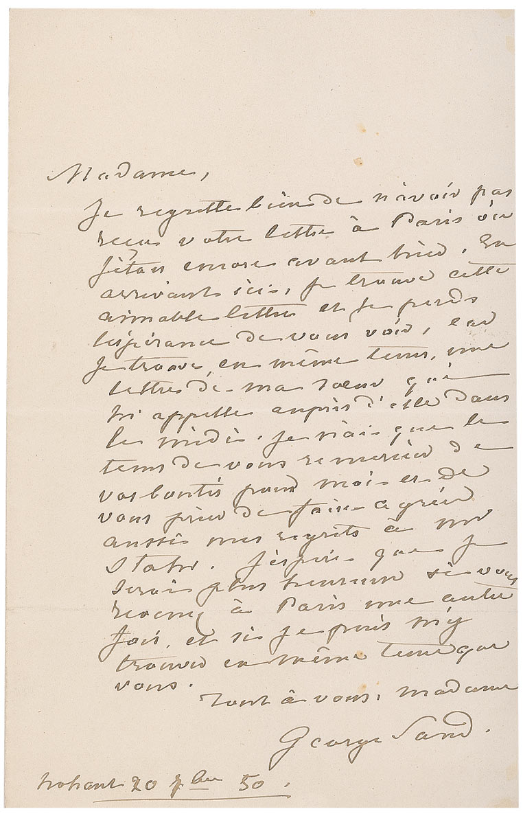 Eminent French author (1804–1876), born Amantine-Lucile-Aurore Dupin, better known by the masculine pen name she adopted early in her career. An early feminist, she also earned a footnote in musical history as the longtime romantic companion of pianist/composer Frédéric Chopin. ALS in French, one page, 5.25 x 8.25, September 20, 1850. Letter to novelist and feminist Fanny Lewald. In part (translated): “I’m very sorry I didn’t get your letter in Paris…I find your fine letter here and I must lose hope of seeing you because letters from my sister…ask me to be with her in the south…I thank you for your kindness towards me…I hope that I will be more fortunate if you return to Paris and I can be there at the same time.” In fine condition, with a few light creases and a couple trivial spots. Accompanied by the original mailing envelope, addressed in Sand’s hand. Desirable correspondence from one 19th century feminist to another!
