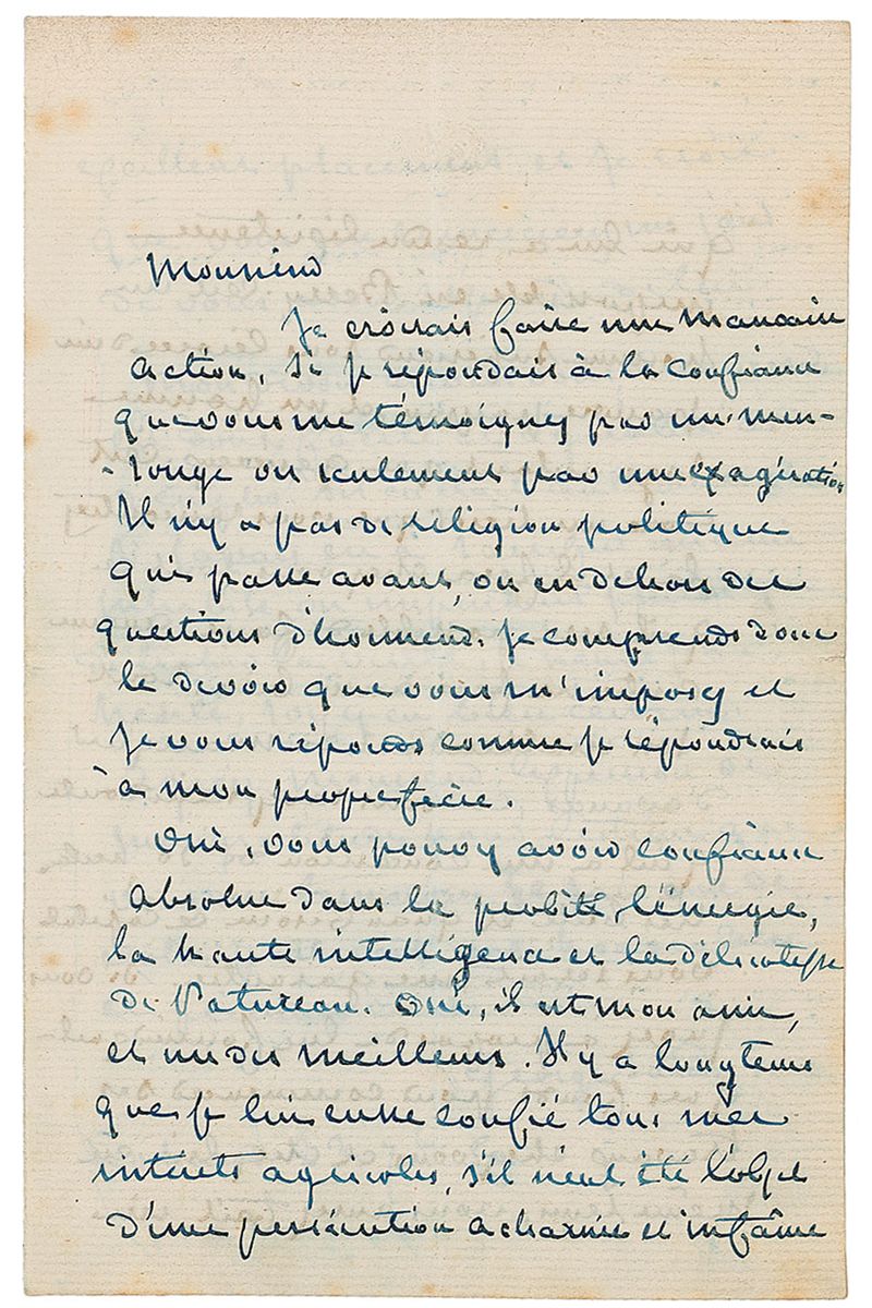 Eminent French author (1804–1876), born Amantine-Lucile-Aurore Dupin, better known by the masculine pen name she adopted early in her career. An early feminist, she also earned a footnote in musical history as the longtime romantic companion of pianist/composer Frédéric Chopin. ALS in French, three pages on two adjoining sheets, 5.25 x 8.25, personal letterhead, September 23, 1859. Letter to Jean-Baptiste Pégot-Ogier, former commissioner of the Republic and deputy from the Gers exiled for his opposition to Napoleon IlI’s coup d’état. In full (translated): “I think I would behave badly if I responded to the confidence you show me with a lie or an exaggeration. There is no political religion which takes precedence over or is outside of questions of honor. I therefore understand the duty which you impose on me and I’m answering you in the same way that I would reply to my own brother. Yes, you can have absolute confidence in Patureau’s probity, energy, great intelligence and tact. Yes he is my friend, and one of the best of them. I would long since have entrusted to him all my agricultural interests if he had not been the object of intense and infamous persecution which made life impossible for him in the Berry [district of France]. He is a superior man beneath the rough exterior of a poor peasant. He is also a wise and generous man. You will therefore find a treasure in him and he will do everything that can possibly be done at your place. Nobody else could do as well. His entire misfortune is that he lacks cash advances, because you undoubtedly know that he has a very fine land grant of 50 hectares and that if necessary this capital would be a guarantee for you. If you deem it suitable to make some funds available to him to start working at your place and at his own place at the same time, you will have made an excellent investment and I think that you will thank me some day for having guaranteed him to you. My duty towards you, Sir, is therefore easy and pleasant to do. If this had not been the case and if I would have had to sacrifice an unskillful or imprudent friend rather than to betray the truth I would not have hesitated. Be quite certain of that.” Central horizontal and vertical folds and some scattered light foxing, otherwise fine condition.