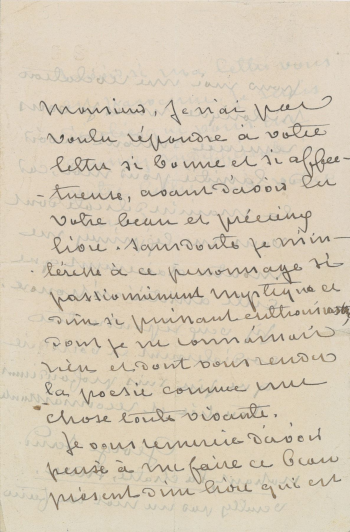 ALS in French, three pages on two adjoining sheets, 5.25 x 8, no date but noted as March 18, 1872 in Sand's published correspondence. Letter to Hebrew scholar Salvatore de Benedetti, thanking him for having sent his book Canzoniere Sacro Di Giuda Levita, a translation of poetry by the great Hebrew poet of the Middle Ages, Judah Halevi. In part (translated): "I didn't want to answer your so good and affectionate letter without having read your beautiful and precious book. No doubt that I'm interested in this person, such a passionate mystic and full of such powerful enthusiasm. I didn't know him at all and now you've rendered his poetry so vividly. I thank you for having given me this beautiful...book that is a historical revelation to me. But above all I thank you for being my friend. The tactful way you express that friendship clearly shows me that such a friendship honors me." In fine condition. Accompanied by an unsigned engraved portrait. A choice example from the sought-after French writer with desirable literary content.