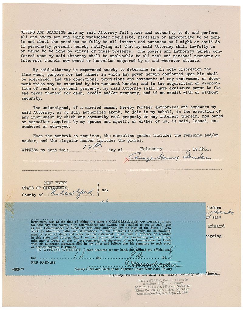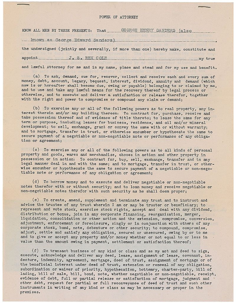 Durable British actor (1906–1972) who won the Academy Award for Best Supporting Actor in All About Eve. He committed suicide at the age of 65. Notarized DS, signed “George Henry Sanders,” two pages, 8.5 x 11, February 12, 1948. Power of Attorney document in which Sanders appoints “J. S. Rex Cole my true and lawful attorney.” Signed on the second page with his very scarce full signature, “George Henry Sanders.” A small County Clerk receipt is affixed to the left edge of the second page. In fine condition, with small red pencil notation next to signature, two staples to top edge, and a mild shade of toning.