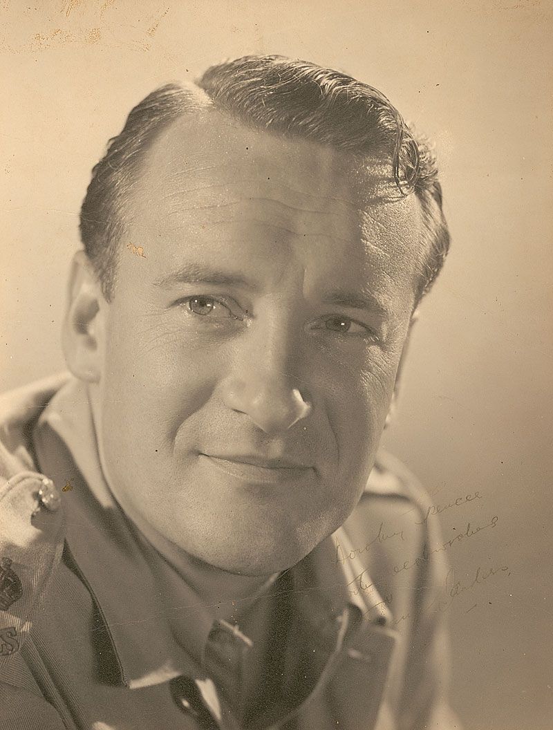Vintage matte-finish 9.5 x 12.5 photo, affixed to an 11 x 14 mount, signed and inscribed in fountain pen, “To Dorothy Spencer, with best wishes from George Sanders.” Scattered light creases through image and portions of signature, some scattered light soiling, small area of surface loss to facial area, and signature and inscription fairly light, but still mostly legible, otherwise very good condition.