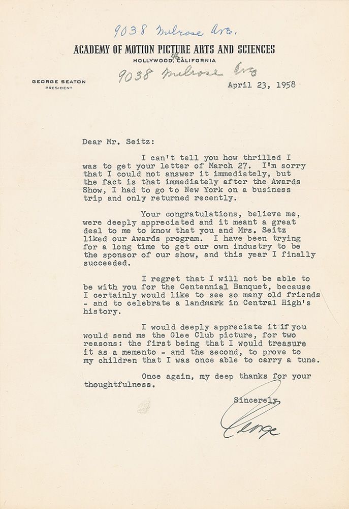 Screenwriter, film director, and producer (1911–1979), who won the Academy Award for Best Adapted Screenplay for Miracle on 34th Street and The Country Girl. TLS signed “George,” one page, 7.25 x 10.5, Academy of Motion Pictures Arts and Sciences letterhead, April 23, 1958. Letter to a friend. In part: “After the Awards Show, I had to go to New York on a business trip and only returned recently. Your congratulations, believe me, were deeply appreciated…I have been trying for a long time to get our own industry to be the sponsor of our show, and this year I finally succeeded.” In fine condition, with light scattered creases and ink and pencil address notations to the top.