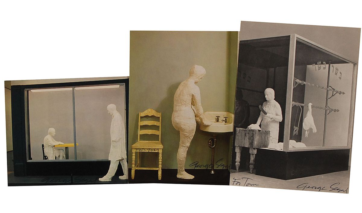 Three postcards of Segal’s impressive works, all approximately 4 x 5.75, including two color, each signed on the front in black ballpoint, with Segal adding brief inscriptions to two of the postcards. In fine condition, with a bit of light skipping to two signatures and light contrast to one signature.