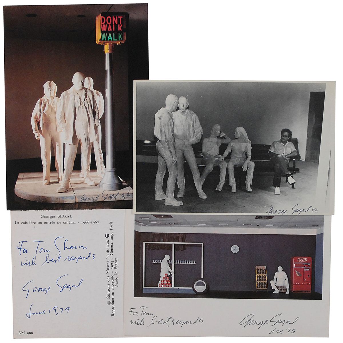 Four postcards of Segal’s works, three color, 6 x 4 and 4.25 x 6, each signed in black ballpoint, with two inscribed and one signed on the reverse. In overall fine condition.