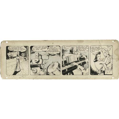 <B>George Shedd - Secret Agent X-9 Daily Try-Out Comic Strip Original Art, dated 1-23-41 (1941).</B></I> Many years before he created the fantastic undersea action-adventure strip, <I>Marlin Keel</B></I>, George Shedd created this "try-out" daily for another action-adventure strip, <I>Secret Agent X-9</B></I>. The image area measures 18" x 5". The art board shows some overall aging, with chipped edges, and scattered staining. There is a water stain along the right edge; otherwise the work is in Good condition.