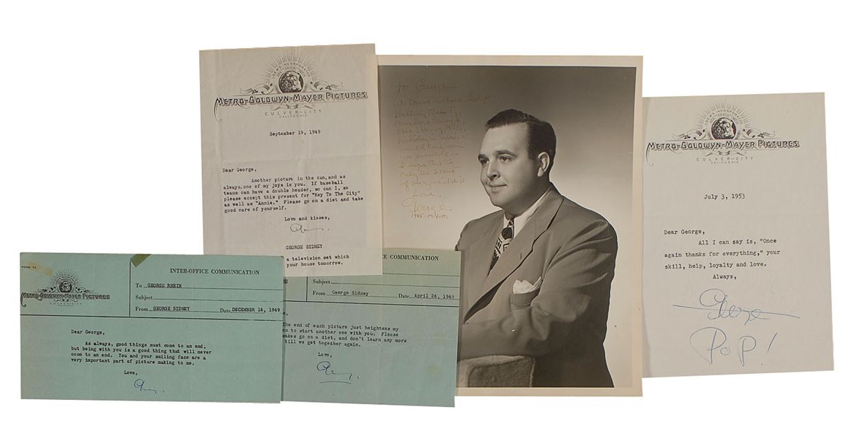 Director and producer (1916–2002) who worked mainly at MGM. Five items: vintage matte-finish 8 x 10 photo, signed and inscribed in fountain pen to assistant director George Rhein, “To George—without whose help Bathing Beauty, Anchors Aweigh, The Harvey Girls, Holiday In Mexico would have been impossible—I hope this is only the start of our friendship. Love, George 1945 MGM”; two short TLSs to George Rhein on MGM pictures letterhead, both signed “George”; and two MGM interoffice communications from Sidney to Rhein, both also signed “George.” In very good condition, with signature and inscription on photo light, but legible, and scattered toning to letters.