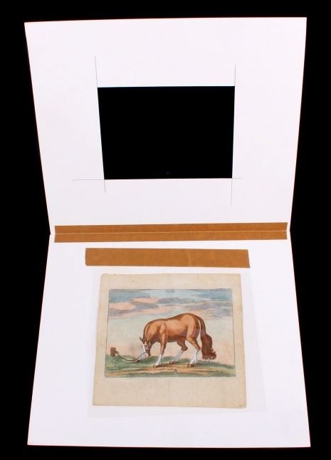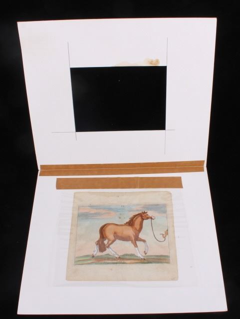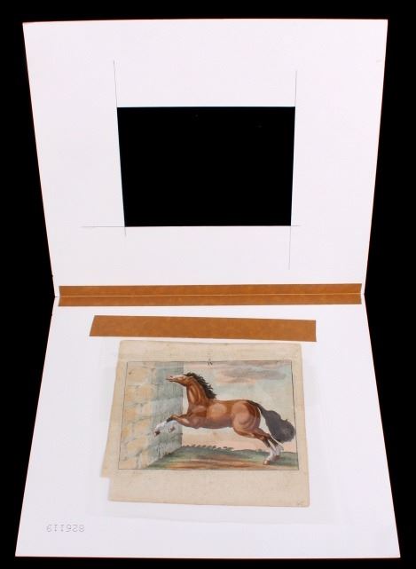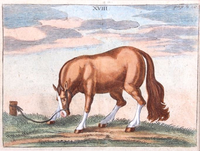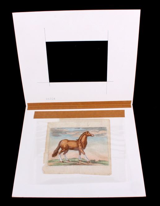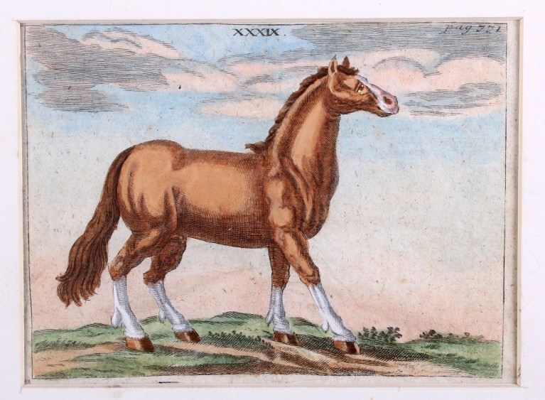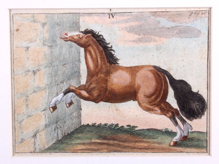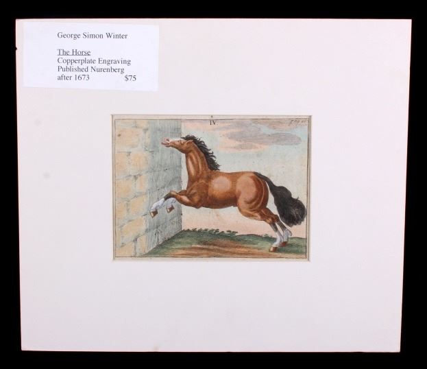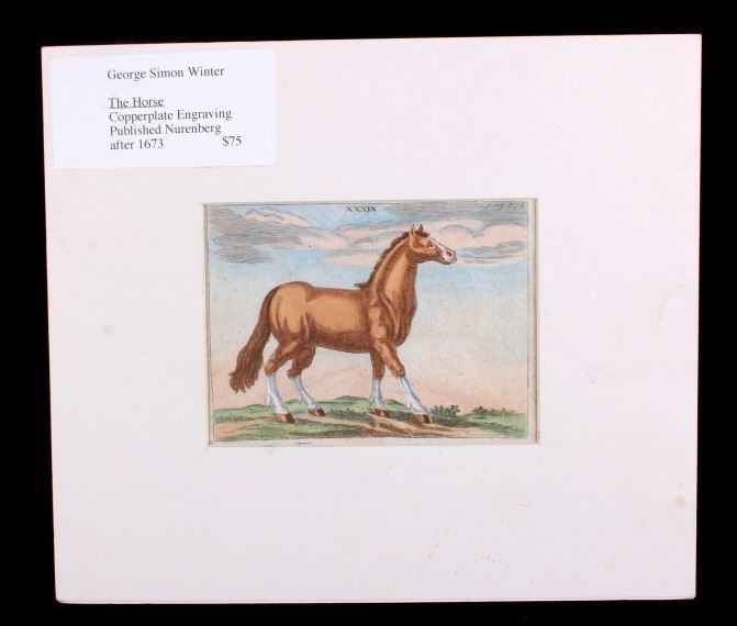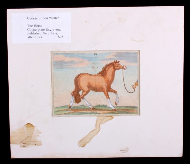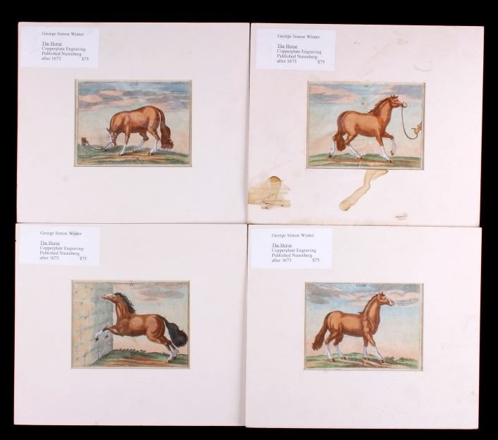 This is a collection of four engravings by George Simon Winter. The engravings are of horses and have been hand tinted. These come from a book published in the late 1600's. Each one has been mounted to mat board with a mat cover. The engravings are in good condition. One of the covers has been stained as shown. Each of the engravings measures approximately 6.75" x 6.75".