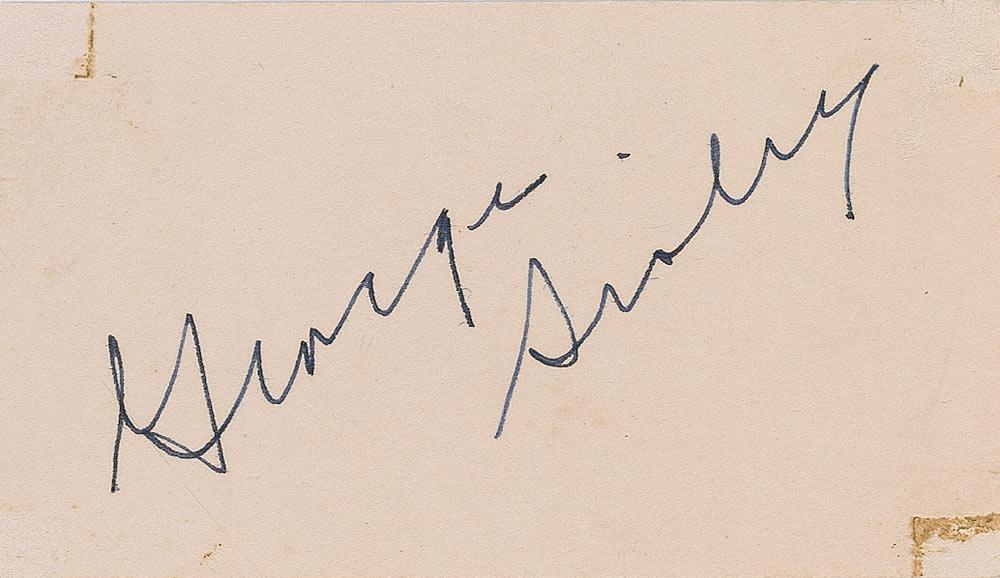 Two items: Vintage 8.25 x 6.25 paperstock photo removed from a Famous Names in Baseball booklet, signed in fountain pen adjacent to his image; and a vintage ink signature, “George Sisler,” on an off-white 3.5 x 2 card. Uniform toning to card, with tape toning to two corners, and light wrinkling to book photo, otherwise fine condition.