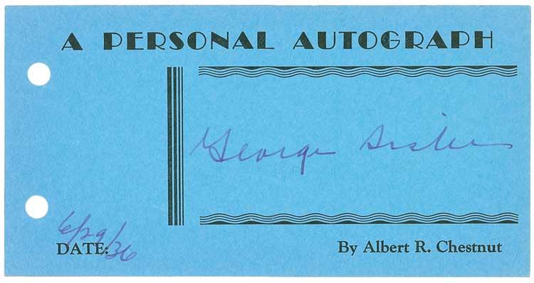 Vintage fountain pen signature, “George Sisler, 6/29/36,” on a 5.5 x 2.75 blue card from the Albert R. Chestnut collection. In fine condition. From his Pennsylvania home, Chestnut, a printer by profession, began collecting autographs in 1935. He sent these personally-printed cards to over a thousand celebrities and received favorable replies from the vast majority, finally retiring from collecting to raise his family when postage increased from 2¢ per card! Pre-certified Steve Grad/PSA/DNA and RRAuction COA.