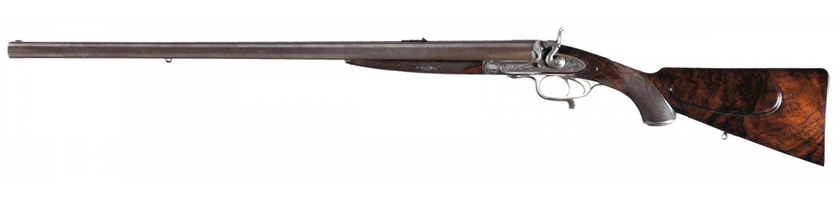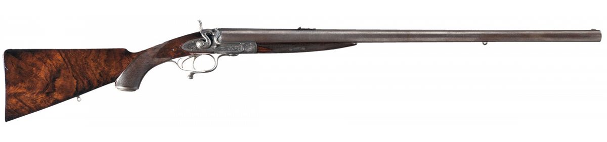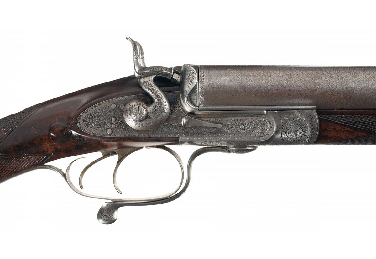 This 12 bore rifle was manufactured by George Smith of London. It has a blade front sight and four leaf express rear sight on a solid rib marked "GEORGE SMITH, NEW BOND STREET, LONDON" with a wedge of engraved scrollwork at the breech. The breech end of the Damascus barrels have a band of scroll engraving and the barrels have an extractor. The lock, hammers, trigger guard and break lever feature an English scroll engraving. The locks are marked "GEORGE SMITH" ahead of the hammer and have sliding hammer safeties. The Jones under lever style action has double triggers. Mounted with a nicely figured pistol grip stock with checkered forearm and grip area, single barrel wedge, ebony forend insert, engraved metal grip cap, sling eyelets, heart shaped inlay behind upper tang, cheekpiece and steel shotgun buttplate. The buttplate has an engraved checkered pattern with scrollwork around the floral blossom engraved screw heads.