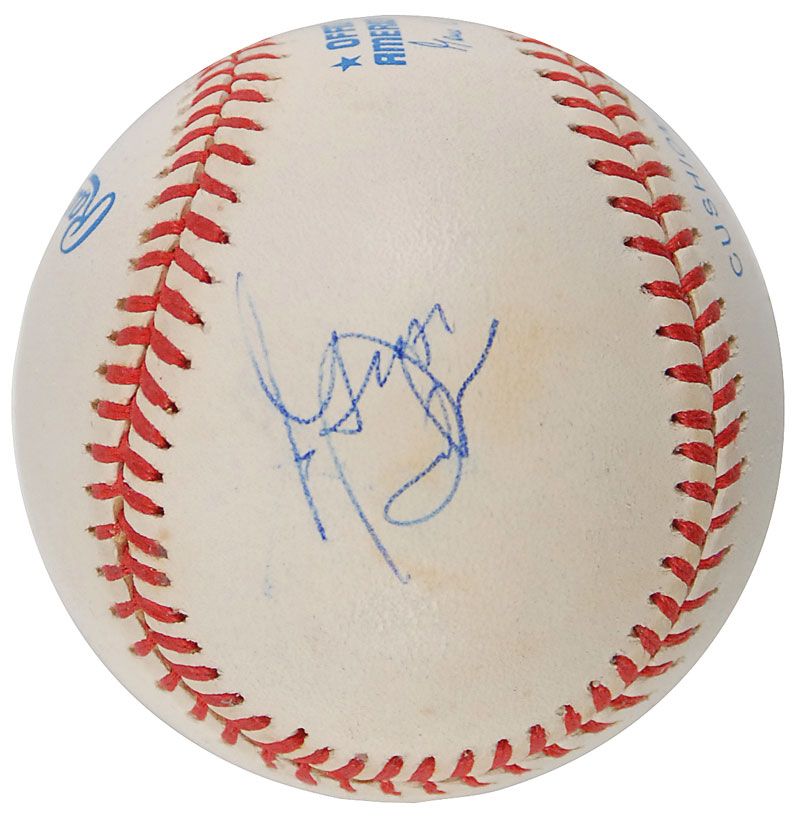Official Rawlings American League baseball signed in blue ballpoint on a side panel. Light toning slightly affecting the signature area, otherwise fine condition.