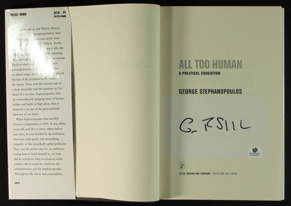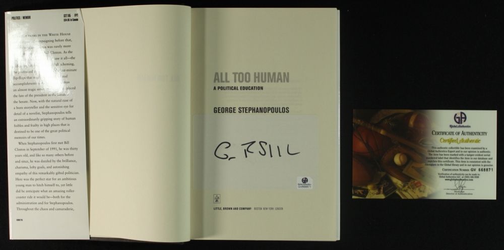 This book has been hand signed inside the cover by George Stephanopoulos. The autograph has been reviewed and authenticated by Global Authentics (GA) and includes their official serially numbered hologram and matching COA for authenticity purposes.