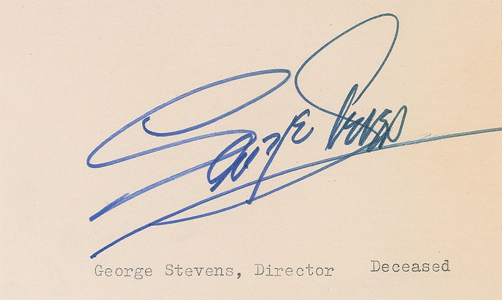 Felt tip signature, “George Stevens,” on an off-white 5 x 3 card. In fine condition.