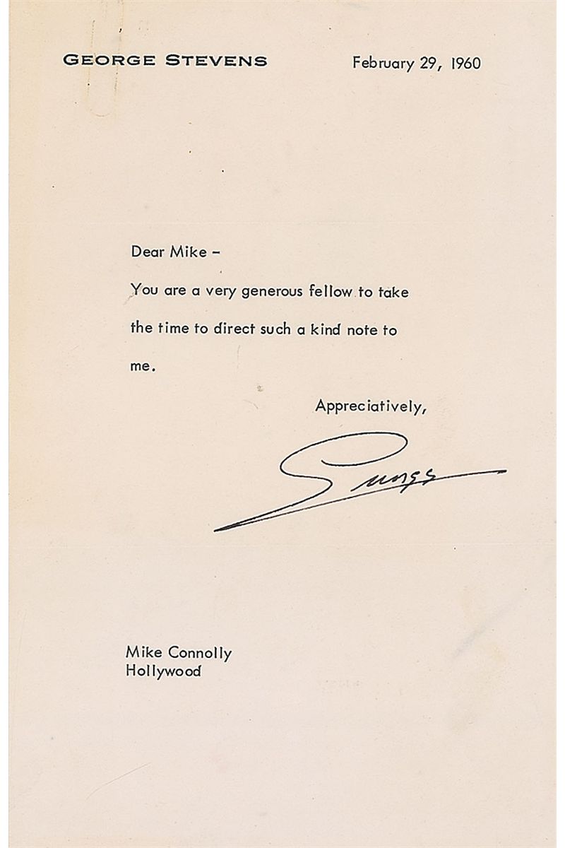 Academy Award–winning director (1904–1975) known for Giant, The Diary of Anne Frank, and A Place in the Sun. TLS signed “George,” one page, 5.5 x 8.5, personal letterhead, February 29, 1960. Letter to Mike Connolly of The Hollywood Reporter. In full: “You are a very generous fellow to take the time to direct such a kind note to me.” In fine condition, with a paperclip mark and impression to the upper left. Accompanied by the original mailing envelope.