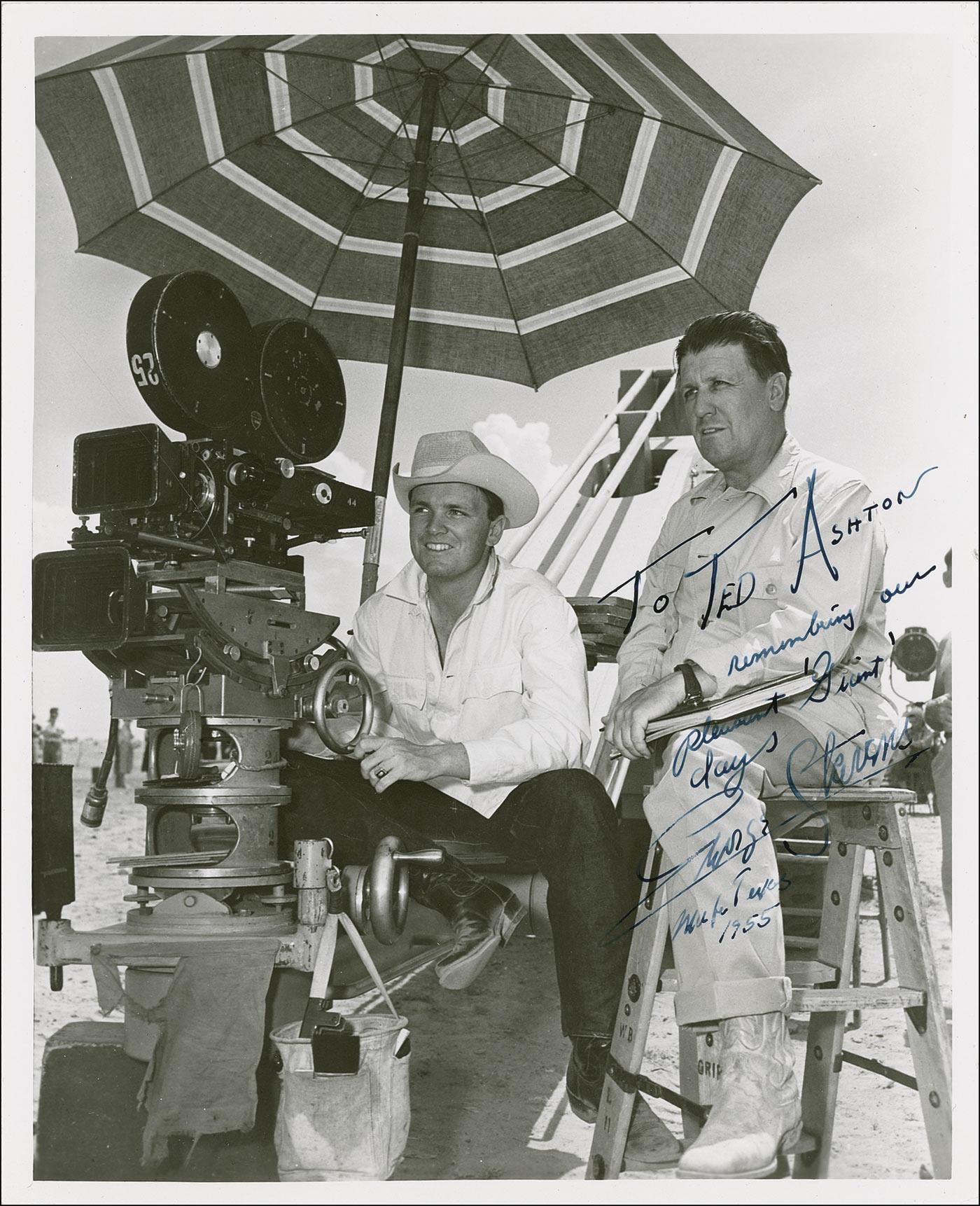 Vintage glossy 8 x 10 photo of Stevens on the set of Giant, a film which he directed, signed and inscribed in fountain pen “To Ted Ashton, remembering our pleasant ‘Giant’ days, George Stevens, Texas 1955.” Accompanied by an unsigned program for the film. In fine condition, with binder dings to right edge, and some scattered light surface marks and creases. Wonderful association in the inscription, with the photo picturing the director on the set of Giant and mentioning the movie.