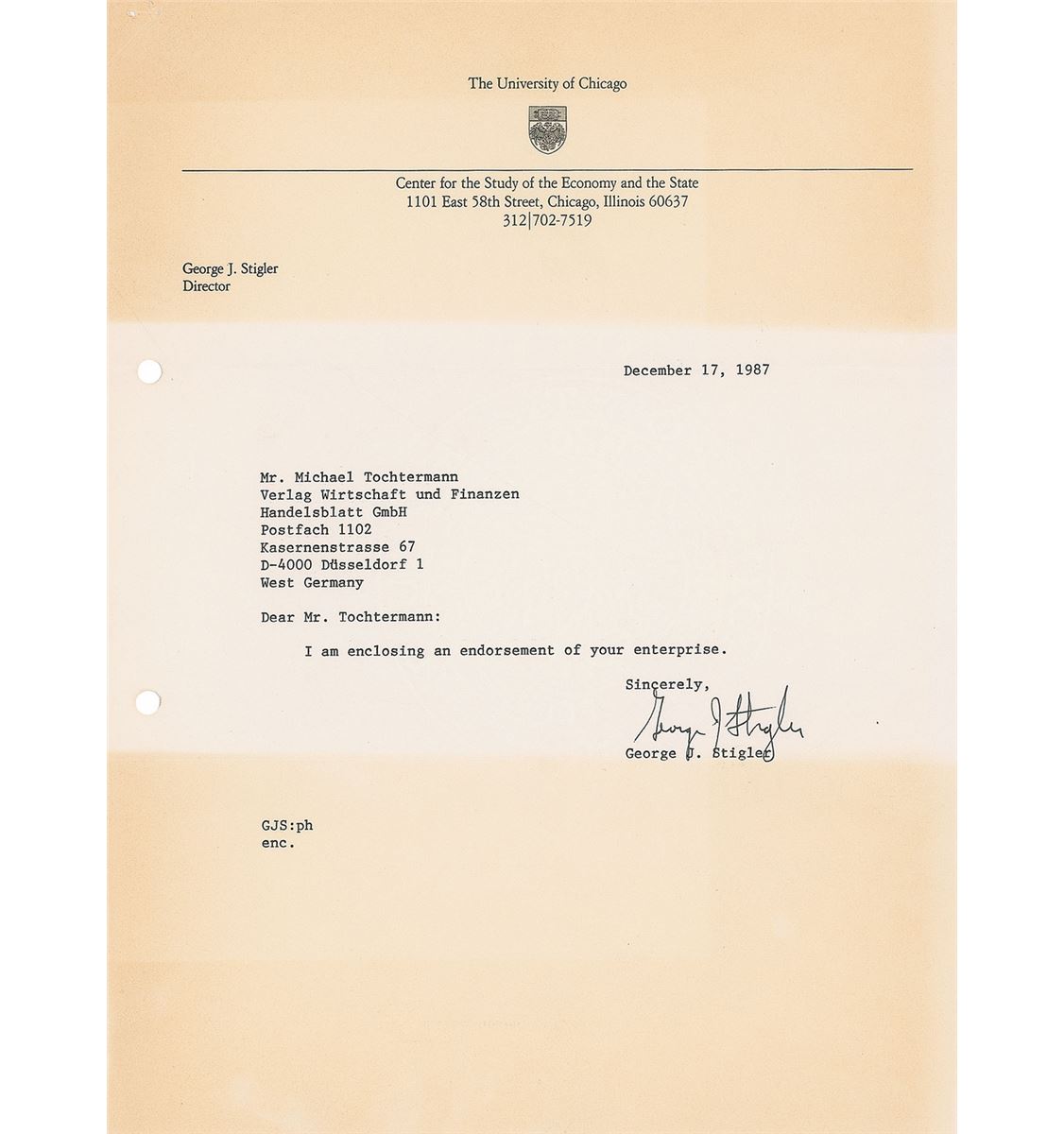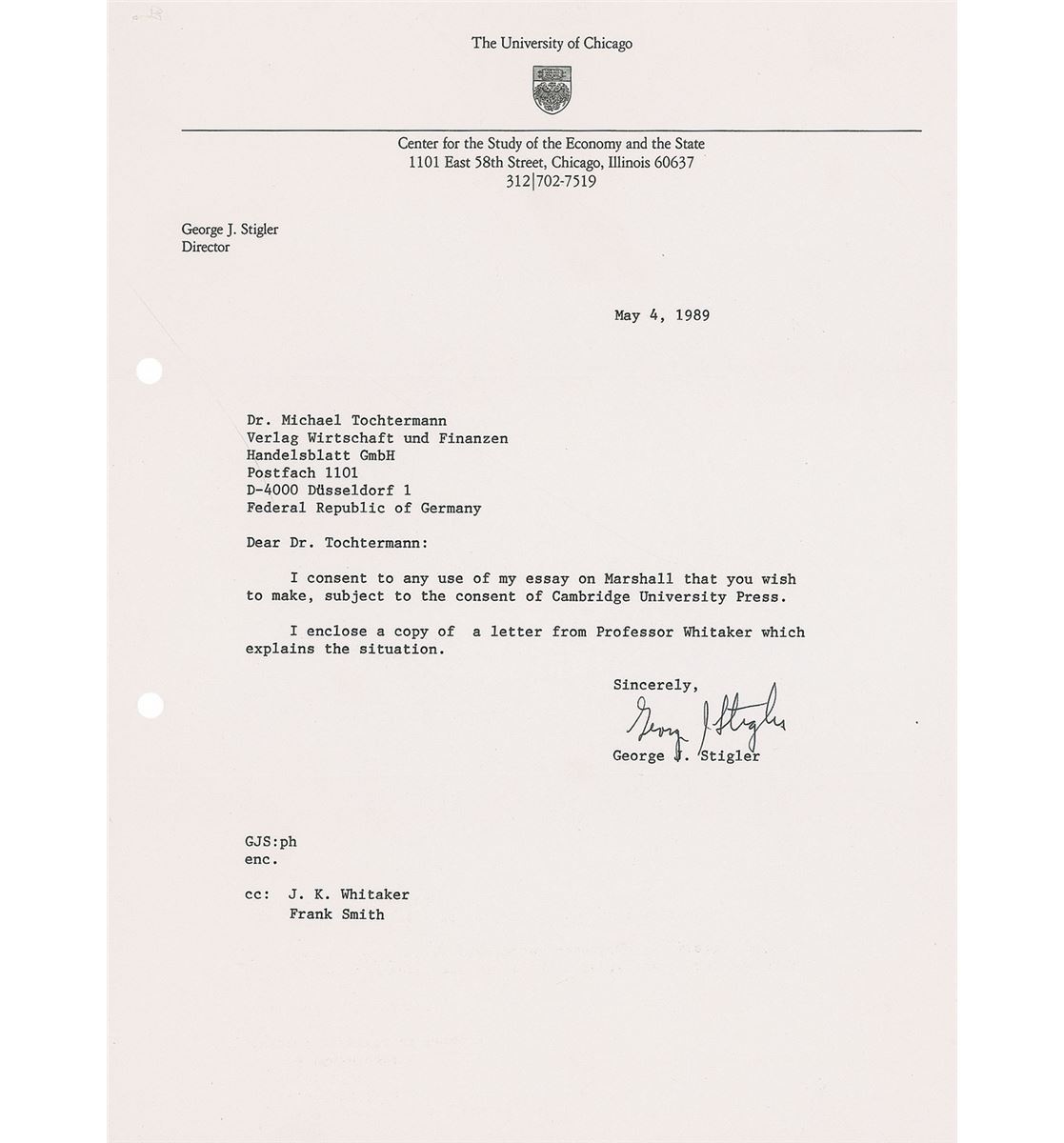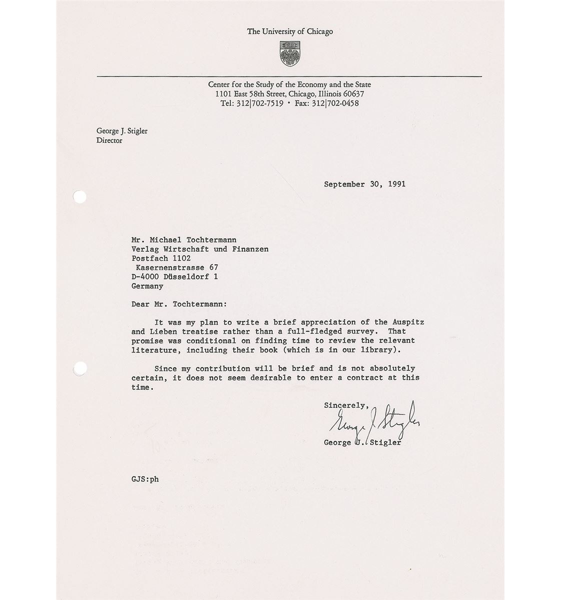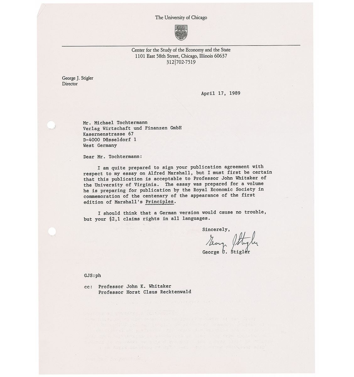 Nobel Prize–winning economist (1911–1991) who was a key leader of the Chicago School of Economics. Four TLSs signed “George J. Stigler,” each one page, 8.25 x 11, dated 1987–1991. Letters to publisher Michael Tochtermann. One, in part: “I am quite prepared to sign your publication agreement with respect to my essay on Alfred Marshall, but I must first be certain that this publication is acceptable to Professor John Whitaker…The essay was prepared for a volume he is preparing for a publication by the Royal economic Society in commemoration of the centenary of the appearance of the first edition of Marshall’s Principles.” Filing holes to the left edges and bands of toning to one letter, otherwise overall fine condition. Accompanied by one secretarially signed letter.