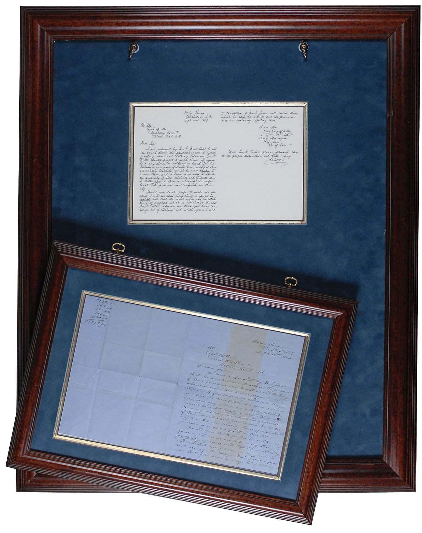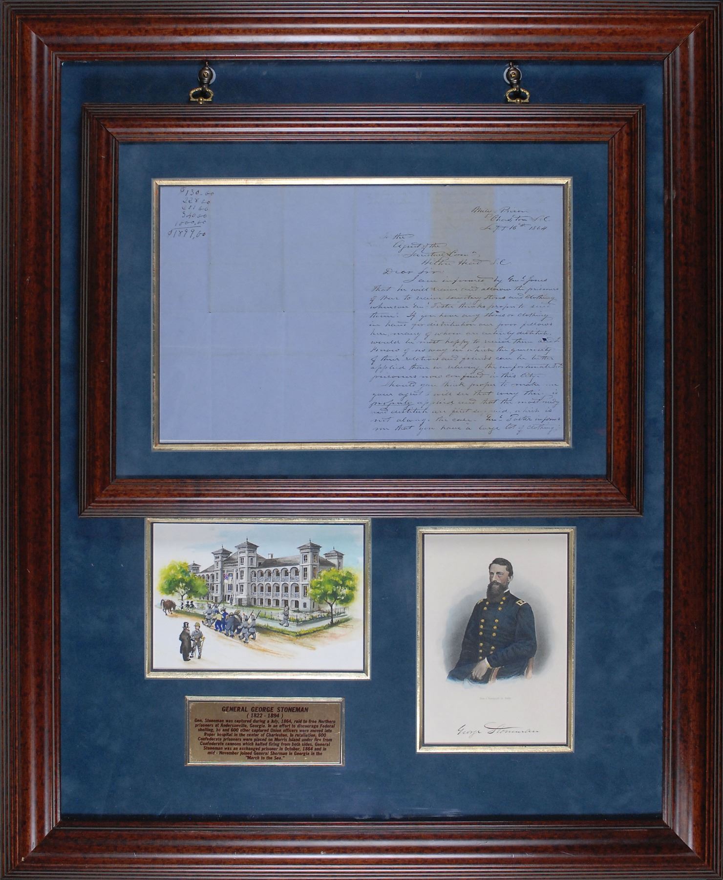 Union cavalry officer (1822–1894) who was later elected the governor of California; during the Civil War, he was captured during a July 1864 attempt to free prisoners from the infamous Andersonville prison, becoming the Union army's highest-ranking prisoner of war. Civil War-dated ALS, signed "George Stoneman, Maj. Gen'l, Pr of War," one page both sides, 8 x 9.75, Mily Prison, Charleston, South Carolina, September 16, 1864. Letter to adjutant of the Sanitary Commission. In full: "I am informed by Gen'l Jones that he will receive and allow the prisoners of war to receiving sanitary stores and clothing whenever Gen'l Foster 'thinks proper to send them.' If you have any stores or clothing in hand for distribution our poor fellows here, many of whom are entirely destitute, would be most happy to receive them, and I know of no way in which the generosity of their relatives and friends can be better applied than in relieving the unfortunate Fed-prisoners now confined in this city. Should you think proper to make me your agent I will see that everything is properly applied and that the most needy and destitute are first supplied, which is not always the case. Gen'l Foster informs me that you have 'a large lot of clothing' and which you will send to Charleston if Gen'l Jones will receive them, which he says he will do an the prisoners here are anxiously expecting them." Stoneman adds a brief postscript at the conclusion: "Will Gen'l Foster please forward this to its proper destination and oblige many prisoners." Attractively triple-matted and framed with the back visible to an overall size of 21.5 x 15.5, hinged onto a lovely triple-matted display featuring two images and descriptive plaque, framed to an overall size of 28.5 x 34.5. In very good to fine condition, with small bits of paper loss along the multiple intersecting folds, and a central band of toning to the first page.
