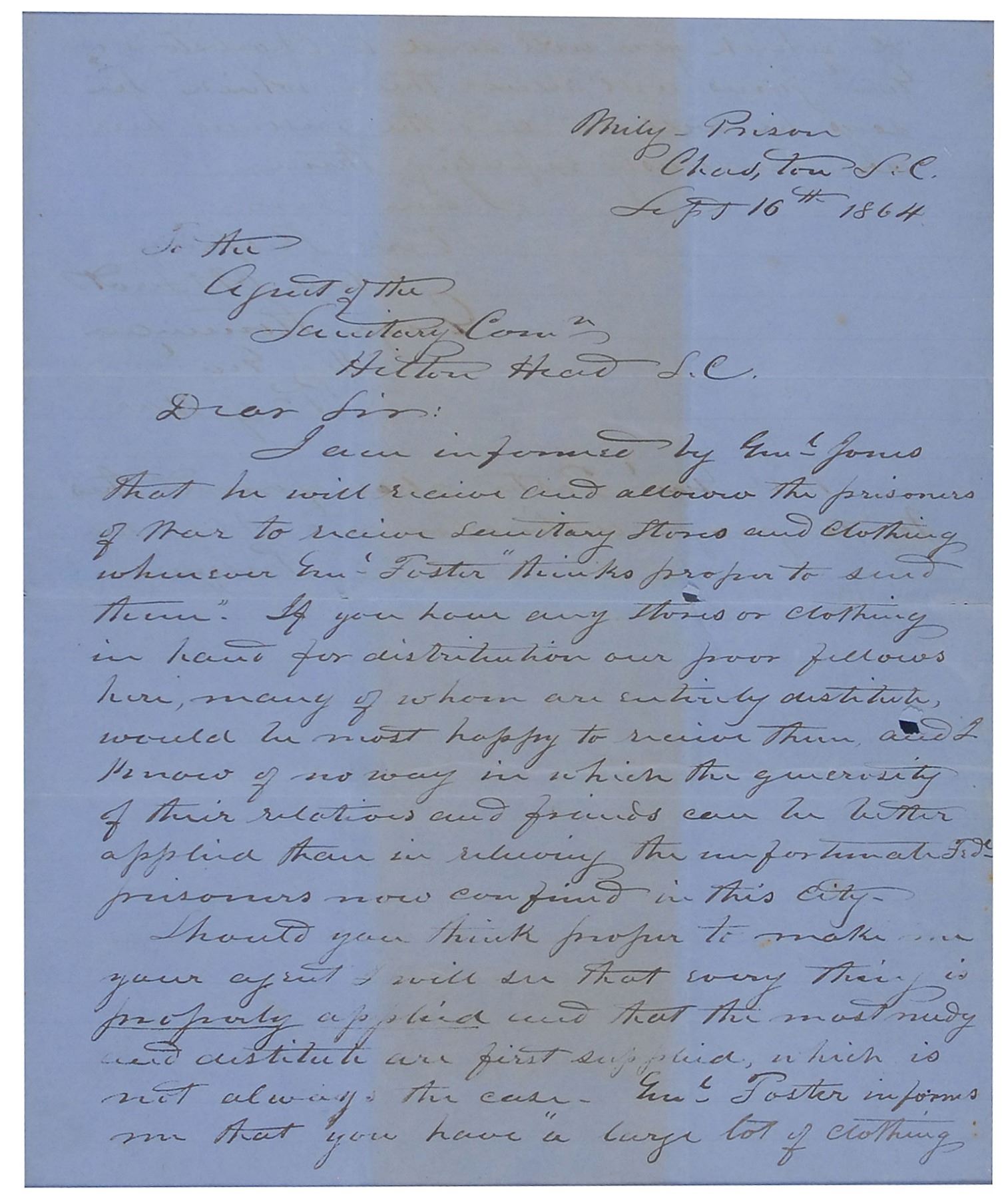 By the summer of 1864, the population at Andersonville prison grew to over 33,000 inmates—overcrowded, severely lacking in food and medical supplies, and fighting against horrendous sanitary conditions, hundreds of prisoners were dying daily. In late July, having almost completely surrounded Atlanta, General Sherman sent Stoneman to destroy the railroads in Macon, hoping to cut off the Confederate supply lines. When given his assignment, he requested permission to—if successful—move east and attempt to release the prisoners at Andersonville. After a chaotic and disorganized effort to cut off Macon, Stoneman and his aide were captured on July 31, 1864. He was exchanged at General Sherman's specific request in October 1864 for Confederate Brigadier General Daniel C. Govan and returned to duty. Written during his brief period as prisoner of war, this letter is characteristic of Stoneman's concern for his fellow man—because of the poor conditions at Andersonville, he volunteered for the risky task of freeing them, and, upon encountering a similar state once held captive himself, he aimed to obtain supplies for the other prisoners.