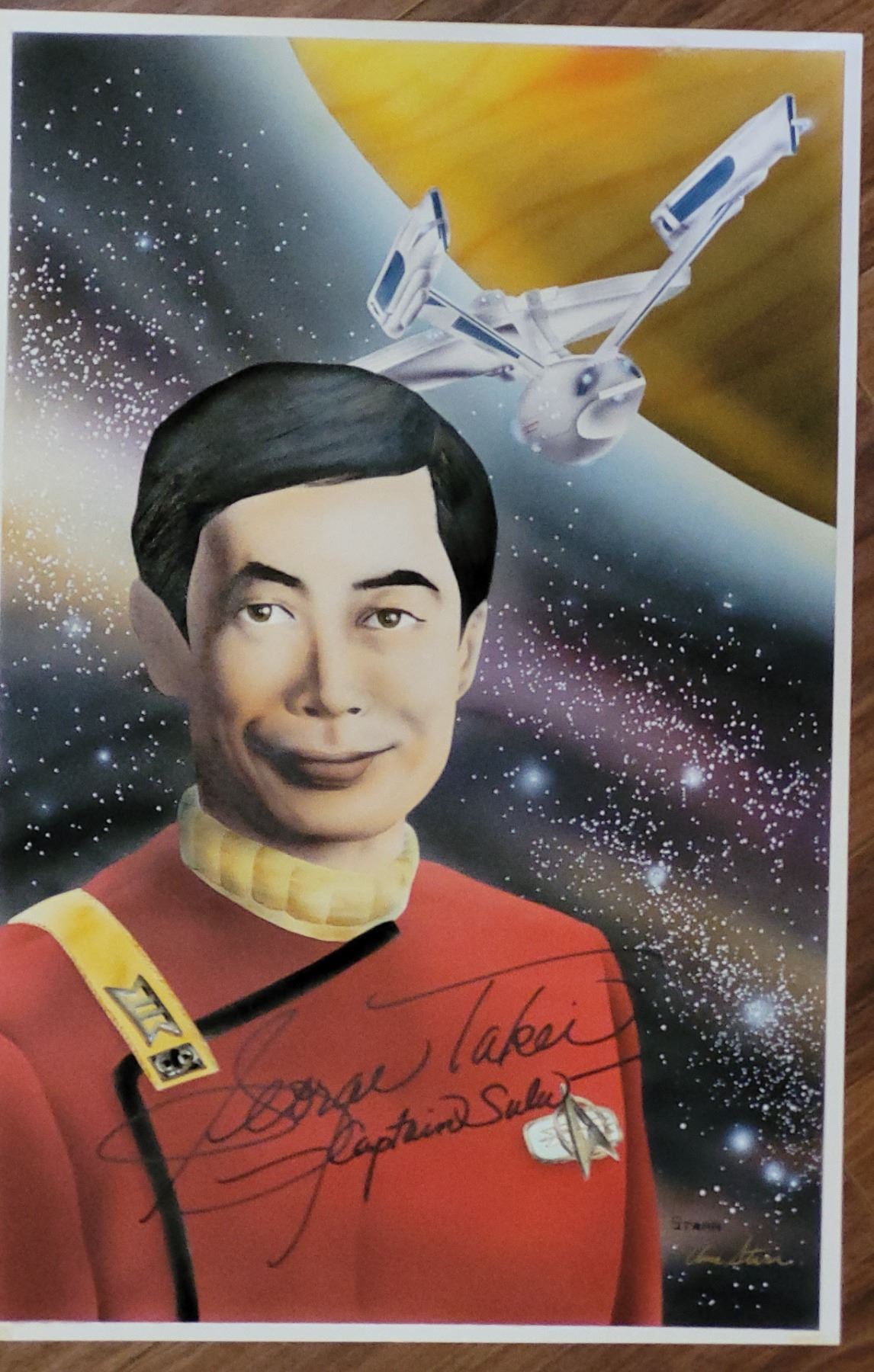Original print by artist Ane Starr featuring and signed by Star Trek actor George Takei. It measures roughly 12x18. All items come with a COA and guarantee for the life of the piece.